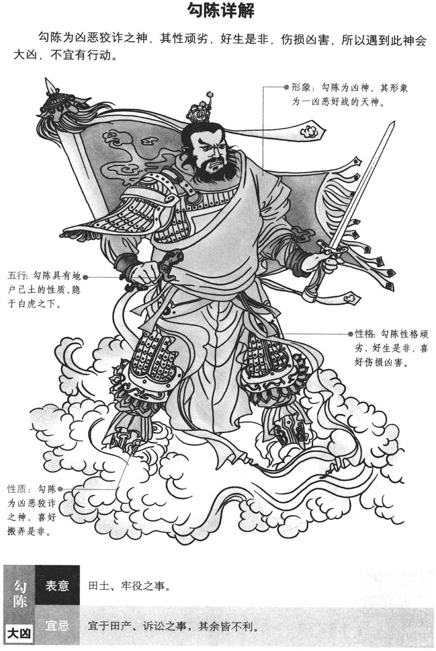 • 勾陈通常被视为凶恶狡诈之神,其性顽劣,好生是非,伤损凶害,遇之多有不顺,行事易遇阻碍、拖延等状况,但具体还需结合格局及用神等综合判断.