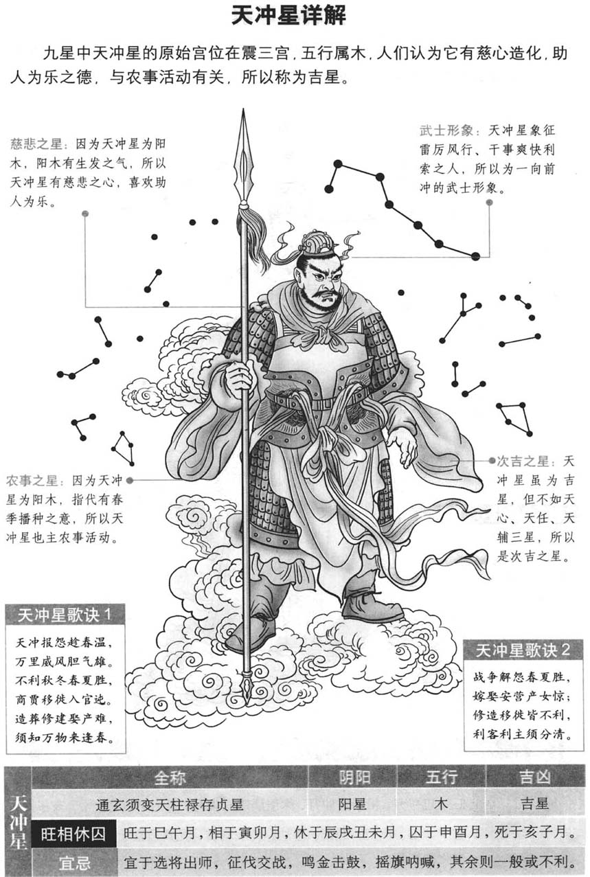 • 天冲星利于征伐交战、报仇解怨、施恩交友,适合选将出征,其临宫时,适宜进行军事行动、竞争对抗等向外扩张、进攻性的事务,在经济领域中,也适合用于开拓新市场等具有挑战性和突破性的工作,但对于嫁娶、修坟、生女孩、外出远行、迁移、修房建屋、埋藏死人等则多有不利。