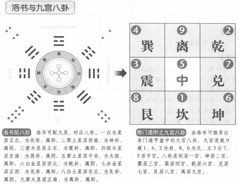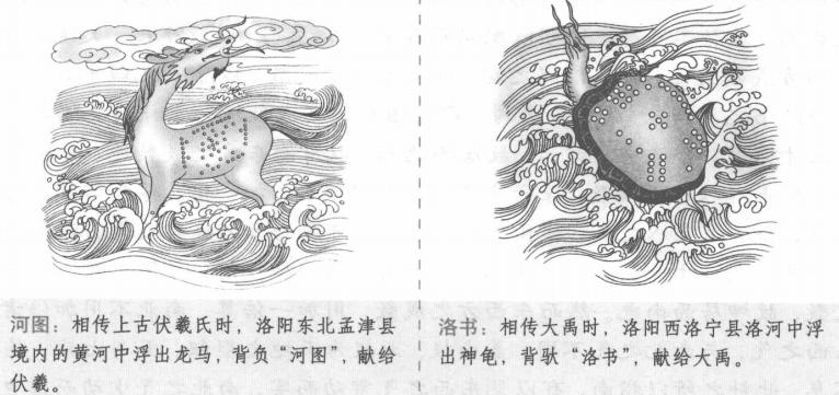 河图洛书概说 黄帝得到的天书中的龙甲图册就是河图洛书,下面就详细介绍一下河图洛书的由来和其中的涵义。 河图洛书由来 据上所述,河图先于黄帝产生,洛书却后于黄帝产生,那么奇门遁甲产生于河图洛书就是矛盾的,于是古人解释说,黄帝在让风后演制奇门遁甲时与后世的洛书产生了暗合现象。 河图洛书的涵义 【白话提要】 又据古代神话传说,在伏羲时期,有一匹龙马出现在黄河上。它的形象马,身有龙鳞,高八尺五寸,长颈,骨骼上长有翅膀,可以在水面上行走。据汉代学者孔安国、刘向的解释,龙马背上生有旋毛如星点一般,后一、六点,前二、七点,左三、八点,右四、九点,中间五、十点,称为龙图,又叫河图。古代河图上的奇偶数与黑白点由此而来。又在大禹冶水的时期,有一个神龟在洛河出现,背上有裂纹,前九、后一,左三、右七,中五,前右二、前左四,后右六、后左八,称为洛书。古代洛书上的点与数字排列由此而来。河图与洛书上的数字配置,现在看来也是很巧妙的。古人认为它们是八卦的起源。但这里有个矛盾现象,黄帝时期还没有大禹与洛书,八卦和奇门遁甲怎么会产生呢?古人勉强解释说,是黄帝的宰相风后在演制时与后世的洛书产生了“暗合”现象。可见,关于古代的各种传说,矛盾、混乱与错误之处是很多的,有时甚至是永远说不清楚的。 河图洛书与奇门遁甲 河图洛书中蕴藏着丰富的涵义,其实由河图可推导出洛书,由洛书可推出与奇门遁甲相关的九宫八卦。 |