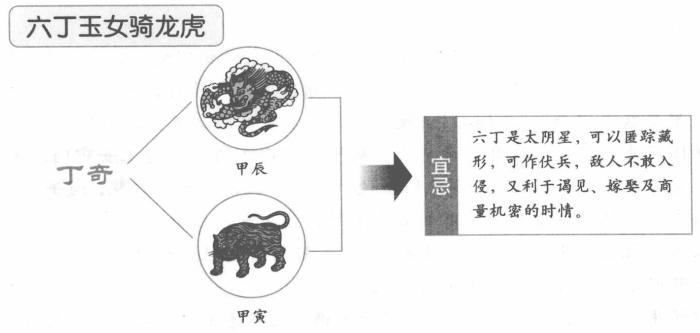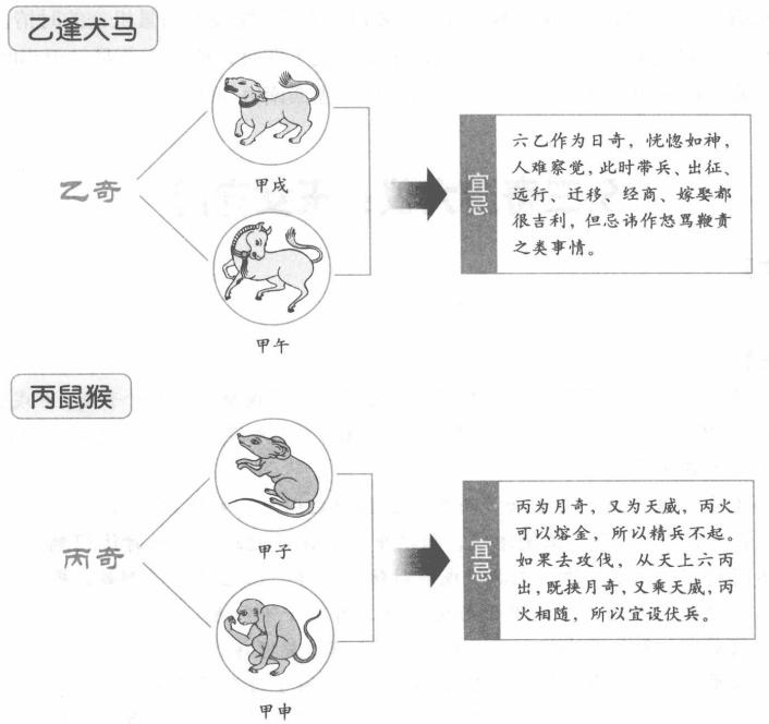 【原文】 乙逢犬马丙鼠猴,六丁玉女骑龙虎。 【原注】 乙奇加甲午为马,加甲戌逢犬也。丙奇加甲子为鼠,加甲申为猴。丁奇加甲辰为龙,加甲寅为虎。谓三奇得使,最为吉也。 《经》曰:“时加六乙,往来恍惚,与神俱出。”谓六乙为日奇,宜从天上六乙出。既随日奇,恍惚如神,人无见者,将兵客胜,闻忧无,闻喜有。行逢饮馔,移徙入官,市贾嫁娶吉,不可行遣怒、鞭杖、嗔责事。 假令冬至上元阳一局,甲己之日,天蓬为值符,至乙丑时,六丁在九宫,以值符加时干。此时天上六乙下临一宫,出北方吉。 “时加六丙,莫兵莫往。”此时候主厌伏兵灾。将兵闻忧无,闻喜有。入官得仙,市贾有利。丙为日奇,又为天威,丙火以销金,精兵不起。若攻伐者,从天上六丙出,既挟月奇,又乘天威,丙火相随,故曰“厌伏兵灾”。假令冬至下元阳四局,甲己之日,平旦平寅,此时六丙下临六宫,宜出西北方吉。六丁为三奇之灵,凡出入用兵,战斗皆吉。故曰:“能知六丁,出幽入冥,至老不刑。刀虽临颈,犹安不惊。”六丁者,六甲之阴神,丁卯之神,字文伯。丁丑之神,字文孙。丁亥之神,字文公。丁酉之神,字文通。丁未之神,字文卿。 丁巳之神,字巨卿。凡斗争出入行来,六丁之神常呼其名,所谓三奇之灵。六丁者,丁卯为甲子之阴,故也。丁奇入宫,会甲辰、甲寅,乃六丁骑龙虎也。天盘六丁,加地盘甲寅、甲辰是也。 又曰:时加六丁,出幽入冥,又六丁为太阴,可以藏形,人皆不见,敌人不敢侵将兵,主胜,闻忧喜各半,可以请谒,利嫁娶及阴私事,入官商贾吉。 假令立夏下元,阳遁二局,甲已之日,夜半甲子时,日出丁卯时。此时六丁在东北,值符天芮,加时干,即六甲下临二宫,出西南方吉。 【白话提要】 这是进一步具体解释三奇得使。犬即甲戌,马即甲午,“乙逢犬马”指天盘乙奇遇地盘甲戌、甲午,即乙奇得使。鼠指甲子,猴指甲申,“丙鼠猴”是指天盘丙奇遇地盘遇甲子、甲申,即丙奇得使。玉女即丁奇,龙指甲辰,虎指甲寅,“六丁玉女骑龙虎”是指天盘丁奇遇地盘甲辰、甲寅,即丁奇得使。 经诀上说:“时加六乙,往来恍惚,与神俱出”,六乙作为日奇,恍惚如神,人难察觉,然而此时带兵、出征、远行、迁移、经商、嫁娶都很吉利,但忌讳作怒骂鞭责之类事情。 例如冬至上元阳遁一局,甲、乙日,天蓬星为值符,到乙丑时六丁在九宫,把值符加转至当时的天干所在位置,天盘上的六乙就下临地盘一宫,一宫是坎宫,位于北方,因此做事往北方向吉利, 经诀上又说:“时加六丙,莫兵莫往。”此时宜设置伏兵。将兵闻忧无,闻喜有。入官得仙,市贾有利。丙为月奇,又为天威,丙火可以熔金,所以精兵不起。 如果去攻伐,从天上六丙出,既挟月奇,又乘天威,丙火相随,所以宜设伏兵。比如冬至下元阳遁四局,甲己日、寅时,这时六丙下临六宫,适宜往西北方向去办事,吉利。 六丁,在天干中居阴,又是甲的女儿,所以称六丁的代号为玉女,古人认为六丁是三奇之中最具灵性的,神出鬼没,履险如夷,凡出入、用兵、作战都可以靠它来取得吉利。六丁是丁卯、丁丑、丁亥、丁酉、丁未、丁巳,是六甲的阴护之神,天盘丁奇会地盘的甲辰、甲寅,为六丁骑龙、骑虎之象。六丁是太阴星,可以匿踪藏形,可作伏兵,敌人不敢入侵,又利于谒见、嫁娶及商量机密的时情。例如立夏下元阳遁第七局,甲、己之日,甲子时或丁卯时,值符天芮星转至当时的天干之宫,则可见六丁下临二宫,二宫为坤,主西南办事吉利。 三奇得使详解 奇门遁甲中的三奇得使格是吉利的,关于三奇得使有歌诀“乙逢犬马丙鼠猴,六丁玉女骑龙虎”,下面就解释其中的涵义。 |