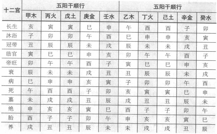 五行十二宫就是每个具体五行在十二个月中从生长到死亡过程的原理,下面就列表介绍十天干的五行十二宫。