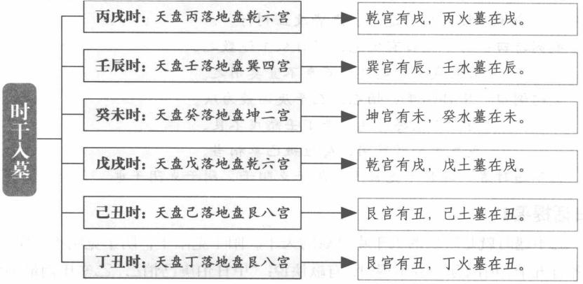 除了上面所述“三奇入墓”之外,还有“时干入墓”的现象。所谓时干入墓,是指时支是时干的墓库,也就是天干与地支配合时的忌讳。丙为阳火,墓在戌,故丙戌时为时干入墓。丁为阴火,墓在丑,故丁丑时为时干入墓。戊为阳土,墓同阳火在戌,故丙戌时为时干入墓。己为阴土,墓同阴火在丑,故己丑时为时干入墓。壬为阳水,墓在辰,故壬辰时为时干入墓。癸为阴水,墓在未。故癸未时为时干入墓。时干入墓的时辰为凶,不可用,否则就如歌诀所说的戊戌、壬辰、丙戌、癸未、丁丑、己丑这六时“亦同凶”了。