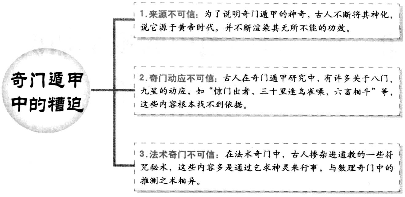 奇门中的历史尘垢 奇门遁甲作为一门特殊的历史文化遗产,经过千百年来的流传、演变,本身难免鱼龙混杂,在封建历史的长河中积淀了不少历史的尘垢,使它作为传统在史文化的信息预测载体的功能常被扭曲和纂改,甚至加入了一些迷信和糟迫。 关于奇门遁甲中的一些不合理内容,大体概括起来主要有以下三个方面: 一是、对奇门遁甲来源的神化说法是不可信的。古代大多数奇门典籍都说是黄帝时代创制了奇门,并把河图洛书与奇门遁甲硬扯到一起。如果奇门遁甲创自黄帝时代,又是如此重要的文化典籍,但在两晋以前的历史中,却没有人提起。与神化其来源一样,在后来的传承中,为了夸大其辞的渲染说:“学会奇门遁,来人不用问”等等。以上这些都是不可信的。 二是、关于八门、九星等的“动应”是唯心的。例如其中有“惊门出者,三十里逢鸟雀噪,六畜相斗”,这些偶然的奇奇怪怪的见闻,显然是幻想或个别现象的连缀成分,不但与今天的常识不能解释,而且在奇门遁甲的理论中也找不到依据。 三是、关于法术奇门中的符咒应当批判。在法术奇门中掺入了一些纯属迷信的符咒内容,如六甲阴符法、真人步斗法、玉女反闭局等,这些都要祭神作法,踏罡布斗,画符念咒,完全通过乞求神灵以行事,这与奇门遁甲以时空数理进行客观推衍的理性精神是大相径庭的。 取其合理内核 当然,不能因为奇门遁甲中有许多主观唯心甚至荒谬的东西,就全盘地否定它。奇门遁甲作为一种文化遗产,在认识世界和把握世界的方法和思路上是有可取之处的,它将时间、空间、数理互相融通,总体性地、多维地规定出万物的存在形式,即任一事物与相关事物的联系性。这是先人在把握客观世界时的一种迥异于西方文化的独特认知科学,这对于哲学和科技的发展有着积极的启发意义和范式价值。总之,在批判保留与扬弃的正确前提下,奇门遁甲作为一个学术项目去研究与探讨应该是正当的,至少可以起到了解古代文化和社会现象的作用。 此信息最后更新时间为:2020-11-5 00:00