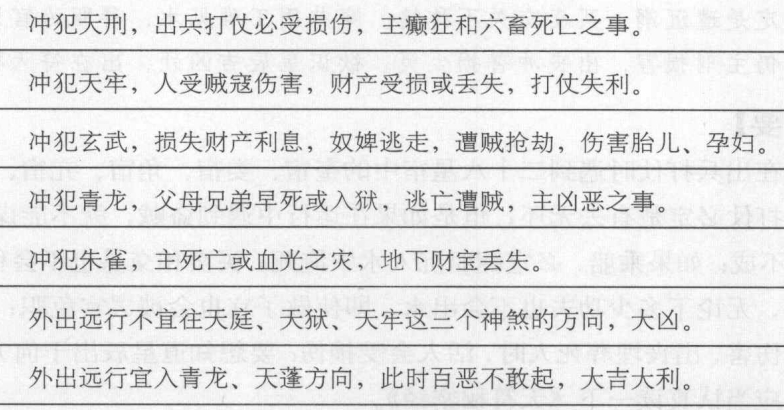 【原文】 建计除阴满罗眠,平定水贪执水破。破木危阳成是土,收紫开金闭月孛。建为青龙用为头,除是明堂黄道游。满为天刑平朱雀,定为金匮吉神求,执为大德值黄道,破为白虎危玉堂。成为天牢坚固守,收为元武盗贼愁开临司命为黄道,勾陈为闭主亡流。黄道出行为大吉,行军斗战黑罢忧凡犯天刑者,出军必伤,主癫狂六畜死亡之事。 犯天牢者,人伤贼害,亡财失利。 犯元武者,亡财走失利息,奴婢遭劫,贼伤胎孕也。 犯青龙者,父母、兄弟、长妇死产,入狱,出逃亡贼,主凶恶事犯朱雀者,因死见血光,亡财于地。 犯白虎者,治明堂。 犯天牢者,治玉堂,即此厌彼处以灾消,大有功。 【原注】 伍子胥曰:凡远行诸事,不得往天庭、天狱、天牢三神,大凶。常乘青龙,历蓬星,凡出行,百恶不敢起,大吉。 【白话提要】 建为计都星,除为太阴,满为罗喉星;平和执为水星,定为贪狼星。破为土星,危为太阳,成为土星;收为紫气星,开为金星,闭为月孛星。建为青龙,除是明堂居于黄道。满为天刑,平为朱雀;定为吉神金。执为天德居于黄道;破为白虎,危为玉堂。成为天牢,宜于坚守,收为玄武,令盗贼发愁,宜于防范盗贼。开为司命居于黄道;闭为勾陈主逃亡。黄道利于出行,主大吉;黑道不利于行军战斗,主忧危。 凡是冲犯天刑者,出兵打仗必受损伤,主癫狂和六畜死亡之事。冲犯天牢者,人受贼寇伤害,财产受损或丢失,打仗失利。冲犯玄武者,损失财产利息,奴逃走,遭贼抢劫,伤害胎儿、孕妇。冲犯青龙者,父母兄弟早死或入狱,逃亡遭贼,主凶恶之事。冲犯朱雀者,主死亡或血光之灾,地下财宝丢失。冲犯白虎者治明堂。冲犯天牢者,治玉堂,即此厌彼处以灾消,大有功。 伍子胥说:“凡是外出远行之事,不得往天庭、天狱、天牢这三个神煞的方向大凶。应当入青龙、天蓬方向,此时百恶不敢起,大吉大利。” 月建属九星出行吉凶 十二月建有十二建星,它们分别对应天上之星,并有出行的吉凶,下面就详细说明。 |