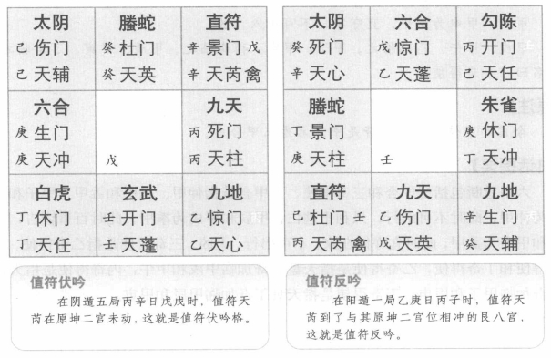 值符是天盘转动的依据,与其相关的主要有伏宫格、飞宫格、值符伏吟和值符反吟四凶格,下面就举例说明其具体格局。