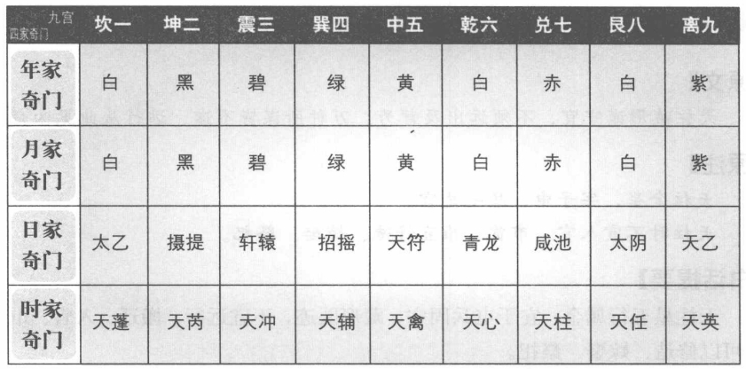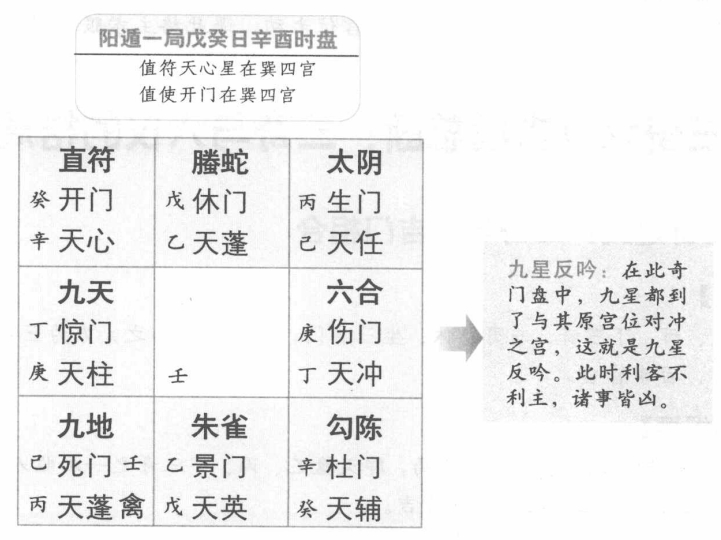 天蓬星吉凶诗断:春夏吉而秋冬凶 【原文】 讼庭争竞遇天蓬,胜捷威名万事同。春夏用之皆大吉,秋冬用此半为凶。 嫁娶远行应少利,葬埋修造亦嫌空。须得生门同丙乙,用之万事得昌隆。 【原注】 天蓬水星,字子禽,居一坎宫。 天蓬时不宜嫁娶、移徙、斗争、入室及修宫室。 【白话提要】 天蓬星五行属水,春秋带兵打仗大吉,而秋冬时则凶。不宜于嫁娶、搬迁、运行、经商、争斗、官司、修建和埋葬等,只有遇上生门和乙奇、丙奇,才可以得到昌盛繁荣。 天芮星吉凶诗断:宜于授道交友 【原文】 授道结交宜芮星,行方值此最难明。出行用事当先退,修造安坟发祸刑。 盗贼惊惶忧小口,更宜因事被官嗔。纵得奇门从此位,求其吉事也虚名。 【原注】 天芮土星,字子成,居二坤宫。 天内时宜授道结交,不可嫁娶言讼。移徙筑室,秋冬吉,春夏凶。 【白话提要】 天芮星五行属土,宜接受教育、受业从师、结交朋友。不利于出行、修造、 安坟等事,有可能遇到盗或惊恐之事,易发生口角或被官府呵斥,纵使有三奇 和吉门,也没有用。 天冲星吉凶诗断:不宜轻进 【原文】 嫁娶安营产女惊,出行移徙遇灾沌。修造葬埋皆不利,万般作事且逡巡。 【原注】 天冲木星,字子翘,居三震宫。 天冲时不宜嫁娶、移徙、入官、筑室、祠祀、市贾。 【白话提要】 天冲星五行属木,不宜嫁娶、移徙、入官、筑室、祠祀、市贾等,一切事情都要先考虑周全,不宜轻进。 天辅星吉凶诗断:万事吉利 【原文】 天辅之星远行良,葬埋起造福绵长。上官移徙皆吉利,喜溢人财万事昌。 【原注】 天辅木星,字子卿,居四巽宫。 天辅时宜请谒、通财,四时吉。嫁娶多子孙,入官、移徙、筑室,吉。 【白话提要】 天辅星五行属木,宜于远行、埋葬、移徙、入官、筑室等皆吉。遇此星会是喜气洋洋而万事昌荣。 不同的九星 奇门遁甲可以分为年家、月家、日家和时家四种,它们所使用的九星也有所区别,主要有以下三种,下面就列表加以说明。 天禽星吉凶诗断:百事丰遂 【原文】 天禽远行偏宜利,坐贾行商俱称意。投谒贵人两益怀,更兼造葬皆丰遂。 【原注】 天禽土星,字子公,居五中宫,附二坤居。 天禽时宜远行、商贾、投谒、见贵、造葬,并吉。 【白话提要】 天禽星五行属土,宜于远行、商贾、投谒、见贵、造葬等都吉利。 天心星吉凶诗断:福禄深厚 【原文】 求仙合药见天心,商途旅福又还新。更将迁葬皆宜利,万事逢之福禄深。 【原注】 天心金星,字子襄,居六乾宫。 天心时宜疗病合药,不宜嫁娶、入官、筑室、祠祀、商贾,秋冬吉,春夏凶。 利见君子,不利见小人。 【白话提要】 天心星五行属金,宜于诊疗疾病和寻配方药,秋冬时利于嫁娶、入官、筑室、祠祀、商贾,春夏则凶。对君子有利,对小人不利。 天柱星吉凶诗断:宜固守藏形 【原文】 天柱藏形谨守宜,不须远出及营为。万种所谋皆不遂,远行从此见凶危。 【原注】 天柱金星,字子申,居七兑宫。 天柱时不宜入官、市贾,惟宜修造、嫁娶、祭祀。 【白话提要】 天柱星五行属金,宜于屯兵固守,藏形匿迹,不宜远行、搬迁、入官、市贾,但可以修造、嫁娶、祭祀。 天任星吉凶诗断:四时皆吉 【原文】 天任吉宿事皆通,祭祀求官嫁娶同。断灭群凶移徙事,商贾造葬喜重重。 【原注】 天任土星,字子韦,居八艮宫。 天任时宜祭祀求福,断灭群凶,四时皆吉。又移徙、入官、祠祀、商贾、嫁娶,吉。 【白话提要】 天任星五行属土,宜于祭祀求福、断灭群凶,四时皆吉。也利于移徙、入官、祠祀、商贾、嫁娶。 天英星吉凶诗断:宜守道修礼 【原文】 天英之星嫁娶凶,远行移徙不宜逢。上官文武皆宜去,商贾求财总是空。 九星伏吟和反吟 奇门遁甲中的九星与宫位之间的关系,可以组成九星伏吟和九星反吟两种格局,下面就举例说明这两个格局的情况。 【原注】 天英火星,字子威,居九离宫。天英时宜蕴身守道,设教修礼。将兵,春夏胜。嫁娶,无子孙。移徙、上官、修营,皆吉,春夏用之,有喜。 【白话提要】 天英星五行属火,宜于蕴身守道,设教修礼,不利于嫁娶、远行、移徙、上官、修营、商贾,春夏用之吉利,秋冬则凶。 九星反吟:星宫反对 【原文】 上盘天蓬,加地盘天英。上盘天芮,加地盘天任。 【白话提要】 九星反吟就是天盘上的星都到了与其原始宫位相冲的宫。比如天蓬星的原宫位是坎一宫,却到了与其对冲的天英星的离九宫。 九星伏吟:天盘同地盘 【原文】 上盘同地盘。主孝服,损人口。 【白话提要】 九星伏吟就是天盘上的星在原始宫位未动,遇此格主孝服,损人口。 |