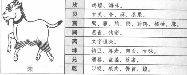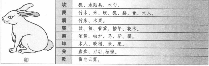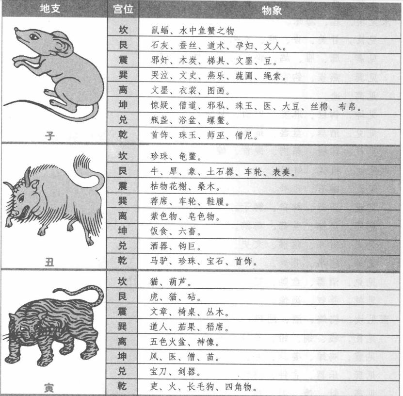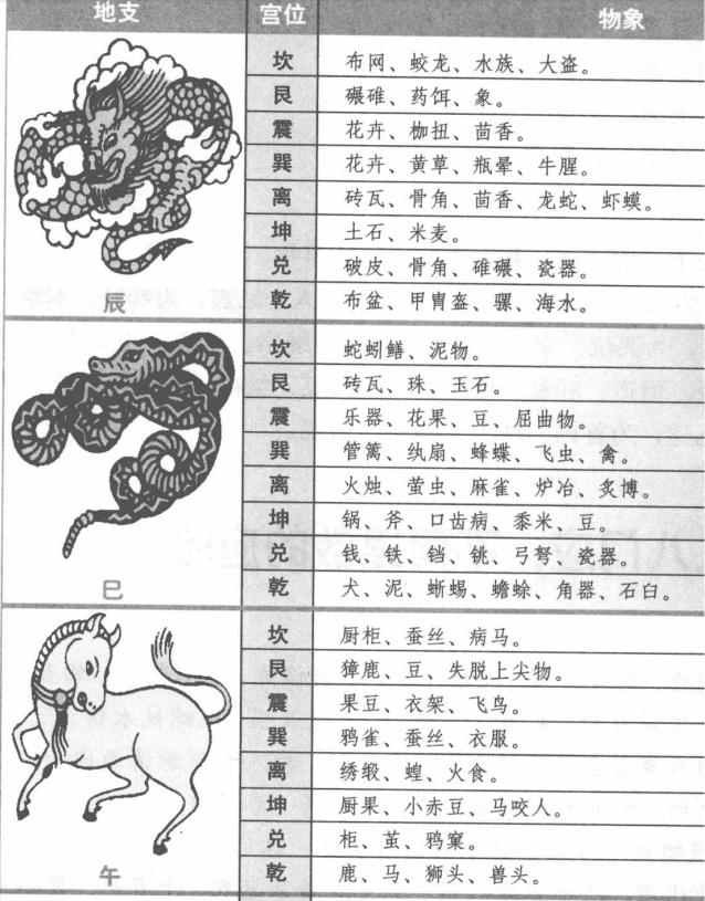 【原文】 子见坎,为鼠蝠、水中物鱼蟹。 见艮,石灰、蚕丝、道术、孕妇、文人。 见震,邪奸、木炭、梯具、文墨、豆。 见巽,哭泣、文史、燕乐、蔬圃、绳索。 见离,文墨、衣裳、图画。 见坤,惊疑、僧道、邪私、珠玉、医、大豆、丝棉、布帛。 见兑,瓶盏、浴盆、螺鳖。 见乾,首饰、珠玉、师巫、僧尼。 丑见坎,珍珠、龟鳖。 见艮,牛、犀、象、土石器、车轮、表奏。 见震,枯物花榭、桑木。 见巽,荐席、车轮、鞋履。 见离,紫色物、皂色物。 见坤,饭食、六畜。 见兑,酒器、钩巨。 见乾,马驴、珍珠、宝石、首饰。 寅见坎,猫、葫芦。 见艮,虎、猫、砧。 见震,文章、椅桌、丛木。 见巽,道人、茄果、稻席。 见离,五色火盆、神像。 见坤,风、医、僧、苗。 见兑,宝刀、剑器。 见乾,吏、火、长毛狗、四角物。 卯见坎,狐、水陆具、木勺。 见艮,竹木、米、砚、狐、貉、兔、术人。 见震,竹床、木栗。 见巽,鼓、笛、管篱、播竿、花木。 见离,笙簧、椒炉、马,驴、骡。 见坤,术人、晚稻、米、果。 见兑,盘盒、刀俎、扭械。 见乾,雷电云雾。 辰见坎,布网、蛟龙、水族、大盗。 见艮,碾碓、药饵、象。 见震,花卉、枷扭、茴香。 见巽,花卉、黄草、瓶晕、牛腥。 见离,砖瓦、骨角、茴香、龙蛇、虾蟆。 见坤,土石、米麦。 见兑,破皮、骨角、碓碾、瓷器。 见乾,布盆、甲胄盔、骡、海水。 巳见坎,蛇蚓鳝、泥物。 见艮,砖瓦、珠、玉石。 见震,乐器、花果、豆、屈曲物。 见巽,管篱、纨扇、蜂蝶、飞虫、禽。 见离,火烛、萤虫、麻雀、炉冶、炙博。 见坤,锅、斧、口齿病、黍米、豆。 见兑,钱、铁、铛、铫、弓弩、瓷器。 见乾,犬、泥、蜥蜴、蟾蜍、角器、石臼。 午见坎,厨柜、蚕丝、病马。 见艮,獐鹿、豆、失脱上尖物。 见震,果豆、衣架、飞鸟。 见巽,鸦雀、蚕丝、衣服。 见离,绣缎、蝗、火食。 见坤,厨果、小赤豆、马咬人。 见兑,柜、茧、鸦窠。 见乾,鹿、马、狮头、兽头。 未见坎,蝗、海味。 见艮,甘美、香、麻、茶果。 见震,鹰、雁、鸠、鸦、药饵、橘柚、麻。 见巽,燕雀、钩帘。 见离,遗。 见坤,钩巨、麻麦、肉面、甘味。 见兑,酒器、盘盏、筵席。 见乾,印绶、祭肉、馒首、蝗。 申见坎,猿猱、蚌蛤。 见艮,磁石、碓磨。 见震,斧刀、杵白、狮子。 见巽,丝棉、姜蒜、鸡鹅。 见离,熨斗、猿猴、文史。 见坤,绢帛、荞麦。 见兑,酒器、盘盏、筵席、刀剑、锁、镜、竹。 见乾,簪钗、画像。 酉见坎,鹑鸽、酒、醋糟、玉。 见艮,钱、铜、铅、石柱、碑碣、碓磨。 见震,鸡雉、姜蒜、麦。 见巽,乐器、古钟、鸡鸭。 见离,针、镜、肉、鸡。 见坤,刀、杖、果、麦。 见兑,金银、剑鞘、铜铁、酒、醋。 见乾,钗钏、首饰、玉石。 戌见坎,葫芦、缸瓮。 见艮,官吏、豺狼、石灰、砧堆。 见震,枷扭、果。 见巽,鞋、石、数珠、鸟窠。 见离,犬、驴、炉、窑冶。 见坤,五谷。 见兑,瓷盆、砖瓦、瓮、钟、剑、锁、鍪、锄。 见乾,朝服、印绶、都官、僧道。 亥见坎,酒、盐、酱、醋、鱼、龟鳖、猪、酢。 见艮,珠玉、图书、哭泣。 见震,梳、檐、梅杏。 见巽,坑、管篱、梅花、绳索、伞盖、笠杖。 见离,心疼、笔墨、图书、灯台、帐幔。 见坤,足、稻、黑豆、猪。 见兑,锁匙、瓮缸。 见乾,幞头、伞盖、猪狗输。 地支到八卦应 地支应就是十二地支到八卦宫中所遇见的物象,下面就列表说明每个地支到八卦宫中所遇见的物象。 上面介绍了子、丑、寅、卯四个地支到八卦宫中的应验,下面介绍辰,巳,午、未四个地支到八卦宫中的应验。 【白话提要】 这里主要讲的是十二地支到八卦宫中所应验的事物。比如子见坎宫,为鼠蝠、水中物鱼蟹。见艮,为石灰、蚕丝、道术、孕妇、文人。见震,为邪奸、木炭、梯具、文墨、豆。见巽,为哭泣、文史、燕乐、蔬圃、绳索。见离,为文墨、衣裳、图画。见坤,为惊疑、僧道、邪私、珠玉、医、大豆、丝棉、布帛。见兑,为瓶盏、浴盆、螺鳖。见乾,为首饰、珠玉、师巫、僧尼。 |