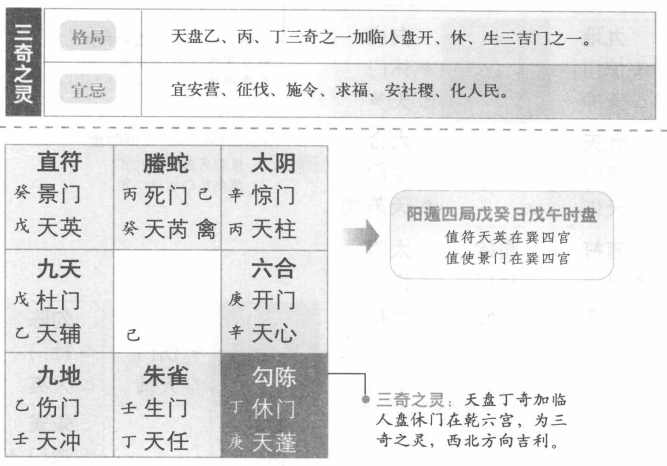 【原文】 葛洪曰:“三奇之灵,宜以出行。”三奇者,六乙为日奇,六丙为月奇,六丁为星奇,与普神并开、休、生三吉门合,则为奇之灵也。三奇与三吉门,其中合共临之即是。吉道清灵,此时此方可以陈兵行营,征伐操练,扬兵耀武,发号施令,俱吉。又曰:“宜求福、安社稷、化人民。" 王璋曰:“九天之上六甲子,九地之下六癸百。三奇之灵六丁卯,六合之中六已巳。” 【原注】 假令冬至下元阳四局,戊癸之日,日中为戊午时,此时戊在四宫,以值符天英加时干六戊,即休门合六丁星奇,下临六宫,西北此方吉。 谓六甲为值符,当战斗之时,士众背值符,所临之宫,而击对冲,无不胜故《经》云:“扬兵九天之上”。所以甲为九天之上者,谓阳称乾,乾主壬甲,乾为天道上升,则甲至壬为九,故六甲为九天。以六甲皆称甲子者,是六甲之始支干之长,皆称甲子故也。 谓“六癸酉”为九地之下者,《易》称坤之六乙、癸,又坤为地道下降,从乙逆数至癸,亦九,故六癸为九地之下。六癸皆称癸西,乃是甲子之中,故凡逃亡绝迹者,宜从六癸之方,避敌亦然。出入无人见者,以者阴干之中,故为九地而言六癸酉也。 谓六丁为三奇之灵,凡出入用兵,战斗皆从天上六丁所临之方而去者,百事皆吉。故《经》云:“能知六丁,出幽入冥,至老不刑。刀虽临项,犹安不惊。” 盖六丁者,六甲之阴神,各有名字:丁卯之神,字文伯;丁丑之神,字文翁;丁亥之神,字文公;丁酉之神,字文卿;丁未之神,字文通;丁已之种,字庭。凡有用事,出入六丁之时,宜合呼其种之字,当得底佑。故云“三奇之灵”。六丁皆然,特举丁卵者,亦举甲子一的,以明前甲子也。 谓六已之位,皆为六合之中,凡为阴谋秘密之事,宜从天上所临六已之方而出入。故《经》云“六合为私门,出入无有见者,故以已已为六合之中”者,谓从甲数至已,六甲与己合,故为六合。六已已者,亦举甲子一旬之义也。 【白话提要】 所谓三奇之灵,就是天盘乙、丙、丁三奇加临人盘开、体、生三吉门。此时可以行军安营,征伐操练,扬兵耀武,发号施令;也宜于求福、安社稷、教化人民。比如阳遁四局,戊癸日,戊午时,天盘丁奇加临人盘休门在乾六宫,这就是三奇之灵,西北方向吉利。 三奇得使示例 三奇得使分为乙奇得使、丙奇得使和丁奇得使,为奇门中的吉格;下面就分别举出阳遁和阴遁的时辰盘来具体说明其格局。 |