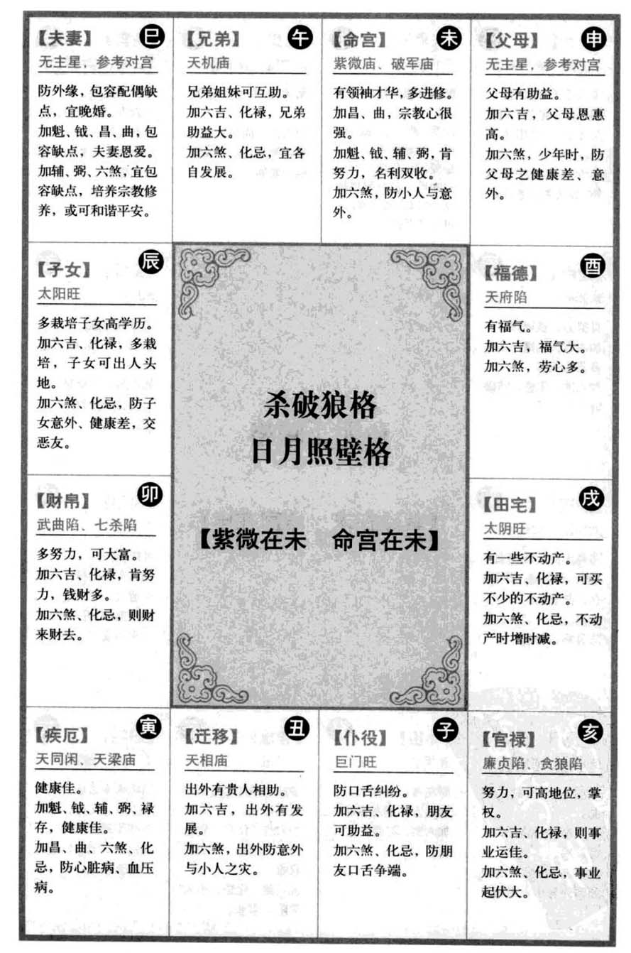 杀破狼格,日月照壁格【紫微在未 命宫在未】 【夫妻宫】无主星,参考对宫 防外缘,包容配偶缺点,宜晚婚。 加魁、钺、昌、曲,包容缺点,夫妻恩爱。 加辅、弼、六煞,宜包容缺点,培养宗教修养,或可和谐平安。 【子女宫】太阳旺 多栽培子女高学历。 加六吉、化禄,多栽培,子女可出人头地。 加六煞、化忌,防子女意外、健康差,交恶友。 【财帛宫】武曲陷、七杀陷 多努力,可大富。 加六吉、化禄,肯努力,钱财多。 加六煞、化忌,则财来财去。 【疾厄宫】天同闲、天梁庙 健康佳。 加魁、钺、辅、粥、禄存,健康佳。 加昌、曲、六煞、化忌,防心脏病、血压病。 【兄弟宫】天机庙 兄弟姐妹可互助。 加六吉、化禄,兄弟助益大。 加六煞、化忌,宜各自发展。 【命宫】紫微庙、破军庙 有领袖才华,多进修。 加昌、曲,宗教心很强。 加魁、钺、辅、粥,肯努力,名利双收。 加六煞,防小人与意外。 【迁移宫】天相庙 出外有贵人相助。 加六吉,出外有发展。 加六煞,出外防意外与小人之灾。 【仆役宫】巨门旺 防口舌纠纷。 加六吉、化禄,朋友可助益。 加六煞、化忌,防朋友口舌争端。 【父母宫】无主星,参考对宫 父母有助益。 加六吉,父母恩惠高。 加六煞,少年时,防父母之健康差、意外。 【福德宫】天府陷 有福气。 加六吉,福气大。 加六煞,劳心多。 【田宅宫】太阴旺 有一些不动产。 加六吉、化禄,可买不少的不动产。 加六煞、化忌,不动产时增时减。 【官禄宫】廉贞陷、贪狼陷 努力,可高地位,掌权。 加六吉、化禄,则事业运佳。 加六煞、化忌,事业起伏大。 此信息最后更新时间为:2024-11-18 11:46