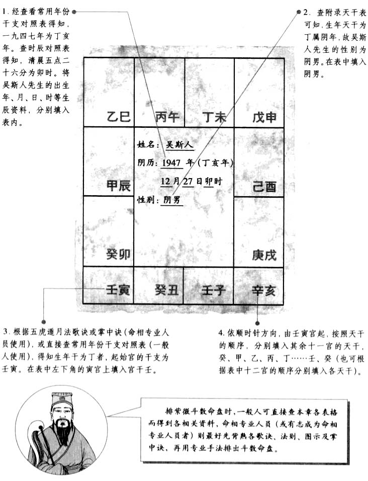 斗数命盘的排列是学习与运用紫微斗数的难点,本节将配合表格具体介绍推查星曜和排命盘的具体步骤与方法,方便简捷,同时为了帮助有志精研斗数者摆脱书本,也提供了用掌指和心算排盘的方法 按下述各步骤,在空白命盘图上一步一步地进行操作,即可完成命盘图的制作。分两种推算方法,一是查表法,方便查阅,二是口诀方式,方便记忆。前者适合人门者,后者适合专业人士及有志于研究紫微斗数的人士,读者根据自身需要任选其中一法即可。 第一步:定十二宫天千 歌诀一:五虎遁月法 甲己之年起丙寅(甲或已年出生者,正月起丙寅) 乙庚之年起戊寅(乙或庚年出生者,正月起戊寅) 丙辛之年起庚寅(丙或辛年出生者,正月起庚寅) 丁壬之年起壬寅(丁或壬年出生者,正月起壬寅) 戊癸之年起甲寅(戊或癸年出生者,正月起甲寅) 歌诀二: 甲己丙作首,乙庚戊为头; 丙辛从庚起,丁壬壬行流; 戊癸何处觅,甲寅好追求。 说明: 1.以寅宫开始各安宫支的理由有二: (1)子开天、丑辟地、寅为人始。 (2)阴历以正月建寅(即阴历正月的地支固定为寅)。2.本歌诀称为五虎遁月法,其理由为: (1)地支寅的生肖属虎。 (2)定十二宫天干即在认定生月的地支(年上起月)。 (3)一般人排斗数命盘,直接查看本章各相关表格即可轻易地排妥命盘,而不用去理各相关的法则、掌中诀、图例和歌诀。命相专业人员,或有志于精研斗数命理的人必须熟记排盘的各相关法则、掌中诀、歌诀和图例,才能不需要翻看书籍,就能迅速排妥命盘。 定宫干掌中诀 查表的方法虽然简单,但有志于研习命理的人不可总是携带着表格。这时,我们就可以运用掌中诀定宫干,只要熟记于心,这种方法随时随地都可以使用,十分方便。 综合实例 紫微斗数排盘程序繁复,前后步骤相互关联,如有一步差之毫厘,结果可能就会谬以千里。故此,本书以吴斯人先生(阴历一九四七年十二月二十七日清晨五点二十六分出生。)为例从排盘的准备工作开始作示范说明。 此信息最后更新时间为:2024-11-14 22:56 |