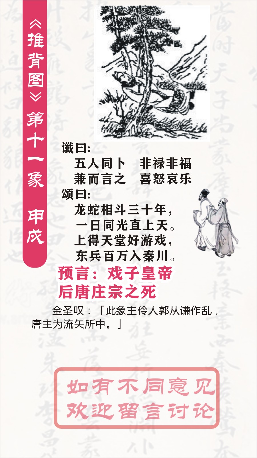 第十一象 申戍兑下坎上节 谶曰: 五人同卜 非禄非福 兼而言之 喜怒哀乐 颂曰: 龙蛇相斗三十年,一日同光直上天。 上得天堂好游戏,东兵百万入秦川。 以下是对《推背图》第十一象的解读: 卦象解读 “申戍兑下坎上节”,节卦象征着节制、节度,有适度、规则之意,也暗示着事物发展会受到一定的约束和规范。兑为泽在下,坎为水在上,泽中的水要遵循一定的节度流动,如同历史发展在这一阶段会有相应的规律和限制因素,为谶语和颂语所描述的内容提供了一种遵循规则、有所节制的背景氛围。 谶语解读 五人同卜,非禄非福: “五人同卜”从字谜角度看,“五”和“人”合起来是个“伍”字,可能暗指以某伍姓人物为核心的一个群体。“非禄非福”表示这个群体所面临的情况并非全是好事,得到的结果不是单纯的福禄,意味着他们的经历较为复杂,既有收获也伴随着风险与困境,不是简单顺遂的命运走向。 兼而言之,喜怒哀乐: 这句话进一步强调了这个群体经历的丰富多样性,“兼而言之”可理解为综合来说,他们在发展过程中体会到了喜怒哀乐等各种不同的情绪,遇到过开心的事、悲伤的事、愤怒的事以及值得欣慰的事等,生动地体现出其命运的曲折以及所经历事件的复杂性。 颂语解读 龙蛇相斗三十年,一日同光直上天: “龙蛇相斗”常被用来形容两种强大势力之间长时间的争斗,在这里也许象征着两股重要力量或者不同阵营之间持续了大约三十年的激烈斗争。“一日同光直上天”表意比较隐晦,一种可能的解读是经过长时间的争斗后,突然出现了某个契机或者某一方获得了极大的发展,如同光芒闪耀、一飞冲天,取得了重大突破或者成就,在局势中占据了优势地位。 上得天堂好游戏,东兵百万入秦川: “上得天堂好游戏”用一种略带诙谐又夸张的表述,可能是说取得优势的一方在局势中处于一种比较轻松、得意的状态,仿佛进入了天堂般自在。“东兵百万入秦川”则点明了重大的军事动向,有数量庞大的来自东方的军队攻入了秦川地区(大致是现在陕西关中一带),预示着一场大规模的军事行动以及由此带来的局势变化,暗示此地会成为重要的战场,对当时的整个局势产生重大影响。 整体意义推测 第十一象整体上似乎是在描绘一个特定历史时期内,以伍姓人物为代表的一个群体有着复杂曲折的命运(五人同卜,非禄非福,兼而言之,喜怒哀乐),同时存在着两股强大势力长时间的争斗(龙蛇相斗三十年),而后一方突然崛起获得优势(一日同光直上天),并且后续还有大规模的东方军队西进关中(东兵百万入秦川)这样的重大军事行动,使得局势更加复杂多变。不过,《推背图》的解读向来带有主观性,很难确切地与具体历史事件一一对应,其真实性也缺乏科学依据,仅供参考研究历史文化时使用。 需理性看待 我们应清楚认识到《推背图》是一部有着神秘色彩的古籍,其中的内容多是后人不断揣摩、解读的对象,其所谓的“预言”并不能被科学所验证。我们要以理性客观的态度去看待它,把它当作了解古代文化、古人思维以及历史演变脉络的一种参考资料,避免过度迷信和不切实际的联想。 第十一象:申戍。兑下坎上,水泽节卦。预言戏子皇帝后唐庄宗之死。 金圣叹:「此象主伶人郭从谦作乱,唐主为流矢所中。」 第1象:(唐朝)甲子 乾下乾上 乾 第2象:(唐朝)乙丑巽下乾上姤(预言武则天称帝) 第3象:(唐朝)丙寅艮下乾上遯(预言武则天造字曌) 第4象:(唐朝)丁卯坤下乾上否(预言张柬之夺回李唐政权) 第5象:(唐朝)戊辰坤下巽上观(预言杨贵妃死于安史之乱) 第6象:(唐朝)已巳坤下艮上剥(预言郭子仪重振大唐) 第7象:(唐朝)庚午震下乾上无妄(吐番部落入寇中原) 第8象:(唐朝)辛未坤下离上晋(李希烈祸乱大唐) 第9象:(唐朝)壬申乾下离上大有(预言黄巢起义) 第10象:(五代)癸酉坎下坎上坎(预言朱温篡唐) 第11象:(五代)申戍兑下坎上节(戏子皇帝后唐庄宗之死) 第12象:(五代)乙亥震下坎上屯(石敬塘割让幽州) 第13象:(五代)丙子离下坎上既济(后周郭威君临天下) 第14象:(五代)丁丑离下兑上革(预言五代终结) 第15象:(北宋)戊寅离下震上丰(宋太祖扫荡群雄) 第16象:(北宋)已卯离下坤上明夷(赵匡胤一统天下) 第17象:(北宋)庚辰坎下坤上师(宋真宗亲征澶渊) 第18象:(北宋)辛巳艮下艮上艮(预言北宋太后刘娥“垂帘听政”) 第19象:(北宋)壬午离下艮上贲(王安石变法) 第20象:(北宋)癸未离下乾上同人(预言蔡京乱政) 第21象:(南宋)甲申兑下艮上损(预言靖康之耻) 第22象:(南宋)乙酉兑下离上睽(康王泥马渡江) 第23象:(南宋)丙戍兑下乾上履(预言蒙古崛起) 第24象:(南宋)丁亥兑下巽上中孚(预言南宋灭亡) 第25象:(元朝)戊子艮下巽上渐(预言元朝国运传10帝) 第26象:(元朝)已丑震下震上震(预言元朝灭亡) 第27象:(明朝)庚寅乾下震上豫(预言明朝开国) 第28象:(明朝)辛卯坎下震上解(预言朱棣篡位) 第29象:(明朝)壬辰巽下震上恒(预言明朝仁宣之治) 第30象:(明朝)癸巳巽下坤上升(预言土木堡之变) 第31象:(明朝)甲午离下巽上家人(预言魏忠贤之乱) 第32象:(明朝)乙未巽下坎上井(预言闯王李自成灭明) 第33象:(清朝)丙申巽下兑上大过(预言清兵入关,传十帝) 第34象:(清朝)丁酉巽下巽上巽(太平天国的预言) 第35象:(清朝)戊戍震下兑上随(火烧圆明园的预言) 第36象:(清朝)己亥乾下巽上小畜(慈喜逃到西安的预言) 第37象:(民国)庚子震下
