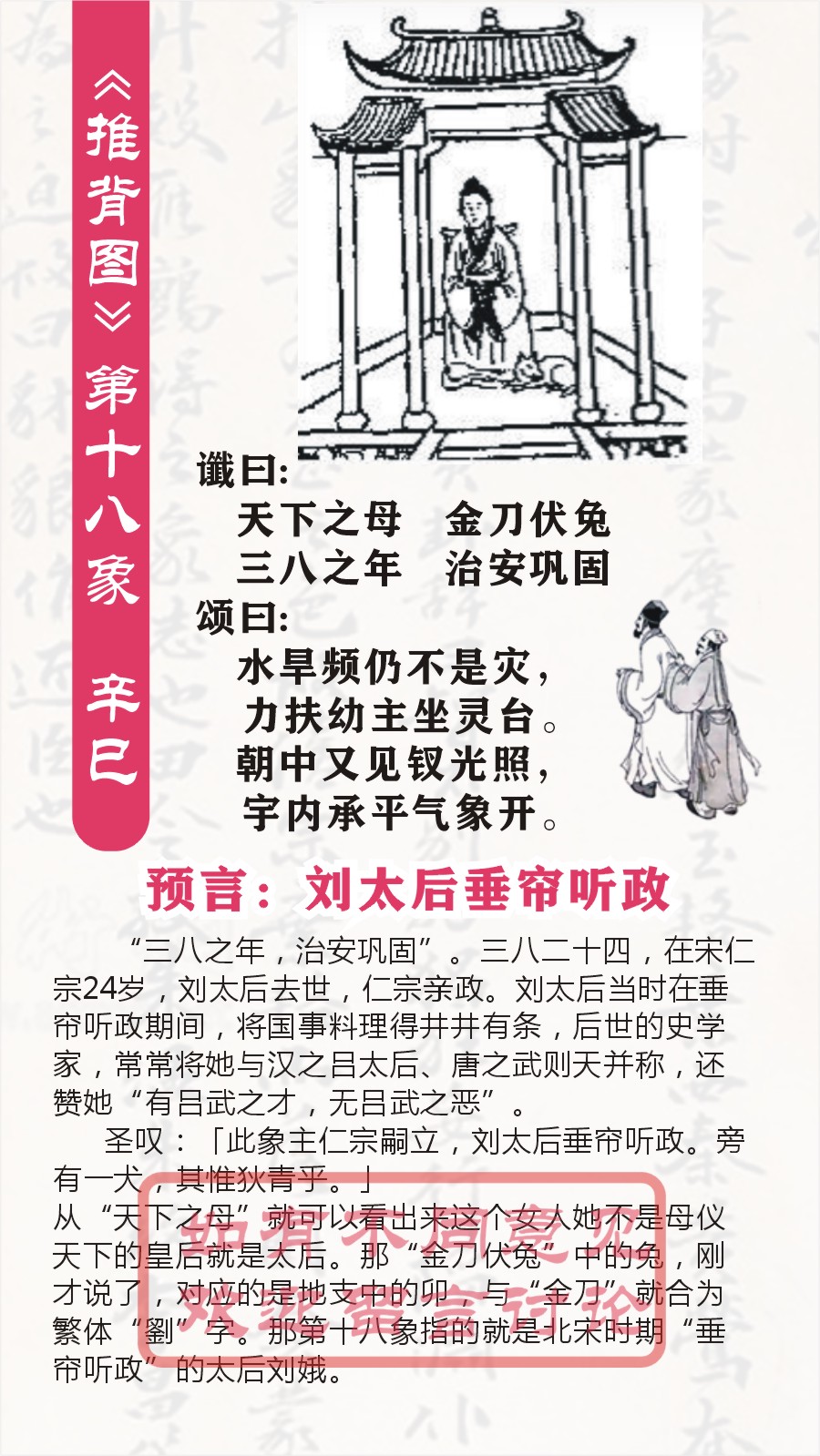 ![]() 〓〓〓《推背图》(图文全解)〓〓〓 第十八象 辛巳艮下艮上艮 谶曰: 天下之母 金刀伏兔 三八之年 治安巩固 颂曰: 水旱频仍不是灾,力扶幼主坐灵台。 朝中又见钗光照,宇内承平气象开。 以下是对《推背图》第十八象的解读: 卦象解读 “辛巳艮下艮上艮”,艮卦象征山,有静止、稳定的含义。两艮相叠,更加强化了这种稳定、静止的态势。就像山一样,坚定不移,给人一种稳固、安宁的感觉,这为谶语和颂语所描绘的相对安定的局面提供了一种卦象上的暗示。 谶语解读 天下之母,金刀伏兔: - “天下之母”通常被认为是指女性统治者或者在背后对朝政有重大影响力的女性。在历史上,这可能暗示着皇太后之类的角色。“金刀伏兔”是一个字谜,“金刀”组合为“刘”(繁体刘字,左半边是金的变形),“伏兔”有压制、掌控之意,或许暗指一位刘姓女性掌控着局势。 三八之年,治安巩固: - “三八之年”如果从数字相乘角度理解为24岁,也可能是其他与数字相关的暗示,比如可能象征着某个特定的时间周期(可能是某位统治者在位的时间阶段等)。“治安巩固”明确表示在这个时期,社会秩序稳定,国家治理良好,没有大的动荡和混乱。 颂语解读 水旱频仍不是灾,力扶幼主坐灵台: - “水旱频仍不是灾”说明尽管自然灾害(如水灾、旱灾)频繁发生,但由于治理有方,这些灾害并没有对国家和社会造成严重的破坏,这体现出当时国家的应对能力较强。“力扶幼主坐灵台”表明有一位关键人物(结合前文可能是那位女性)努力扶持年幼的君主坐在皇位上,发挥了辅佐作用,保证政权的稳定传承。 朝中又见钗光照,宇内承平气象开: - “朝中又见钗光照”再次强调女性在朝廷中的重要地位,“钗”常用来指代女性,其光芒闪耀意味着女性的影响力显著。“宇内承平气象开”描绘出整个国家境内呈现出太平的景象,社会繁荣,百姓生活安定,开启了一个和平稳定的时期。 整体意义推测 这一象可能是在描述一个特定的历史时期,有一位刘姓女性(天下之母,金刀伏兔)发挥关键作用,在某个阶段(三八之年)使国家的治安得到巩固。在她的治理或者辅佐下,尽管有自然灾害但国家仍能应对自如(水旱频仍不是灾),并且扶持幼主稳定政权(力扶幼主坐灵台),让女性在朝廷中的影响力凸显(朝中又见钗光照),国家也迎来了太平盛世(宇内承平气象开)。不过,《推背图》的解读具有很强的主观性,很难确切地与具体历史事件一一对应,其真实性也缺乏科学依据,仅供参考研究历史文化时使用。 第十八象:辛巳。艮下艮上,艮卦。预言刘太后垂帘听政,辅佐仁宗。旁有一犬,其惟狄青乎。 圣叹:「此象主仁宗嗣立,刘太后垂帘听政。旁有一犬,其惟狄青乎。」 从“天下之母”就可以看出来这个女人她不是母仪天下的皇后就是太后。那“金刀伏兔”中的兔,刚才说了,对应的是地支中的卯,与“金刀”就合为繁体“劉”字。那第十八象指的就是北宋时期“垂帘听政”的太后刘娥。 “三八之年,治安巩固”。三八二十四,在宋仁宗24岁,刘太后去世,仁宗亲政。刘太后当时在垂帘听政期间,将国事料理得井井有条,后世的史学家,常常将她与汉之吕太后、唐之武则天并称,还赞她“有吕武之才,无吕武之恶”。 第1象:(唐朝)甲子 乾下乾上 乾 第2象:(唐朝)乙丑巽下乾上姤(预言武则天称帝) 第3象:(唐朝)丙寅艮下乾上遯(预言武则天造字曌) 第4象:(唐朝)丁卯坤下乾上否(预言张柬之夺回李唐政权) 第5象:(唐朝)戊辰坤下巽上观(预言杨贵妃死于安史之乱) 第6象:(唐朝)已巳坤下艮上剥(预言郭子仪重振大唐) 第7象:(唐朝)庚午震下乾上无妄(吐番部落入寇中原) 第8象:(唐朝)辛未坤下离上晋(李希烈祸乱大唐) 第9象:(唐朝)壬申乾下离上大有(预言黄巢起义) 第10象:(五代)癸酉坎下坎上坎(预言朱温篡唐) 第11象:(五代)申戍兑下坎上节(戏子皇帝后唐庄宗之死) 第12象:(五代)乙亥震下坎上屯(石敬塘割让幽州) 第13象:(五代)丙子离下坎上既济(后周郭威君临天下) 第14象:(五代)丁丑离下兑上革(预言五代终结) 第15象:(北宋)戊寅离下震上丰(宋太祖扫荡群雄) 第16象:(北宋)已卯离下坤上明夷(赵匡胤一统天下) 第17象:(北宋)庚辰坎下坤上师(宋真宗亲征澶渊) 第18象:(北宋)辛巳艮下艮上艮(预言北宋太后刘娥“垂帘听政”) 第19象:(北宋)壬午离下艮上贲(王安石变法) 第20象:(北宋)癸未离下乾上同人(预言蔡京乱政) 第21象:(南宋)甲申兑下艮上损(预言靖康之耻) 第22象:(南宋)乙酉兑下离上睽(康王泥马渡江) 第23象:(南宋)丙戍兑下乾上履(预言蒙古崛起) 第24象:(南宋)丁亥兑下巽上中孚(预言南宋灭亡) 第25象:(元朝)戊子艮下巽上渐(预言元朝国运传10帝) 第26象:(元朝)已丑震下震上震(预言元朝灭亡) 第27象:(明朝)庚寅乾下震上豫(预言明朝开国) 第28象:(明朝)辛卯坎下震上解(预言朱棣篡位) 第29象:(明朝)壬辰巽下震上恒(预言明朝仁宣之治) 第30象:(明朝)癸巳巽下坤上升(预言土木堡之变) 第31象:(明朝)甲午离下巽上家人(预言魏忠贤之乱) 第32象:(明朝)乙未巽下坎上井(预言闯王李自成灭明) 第33象:(清朝)丙申巽下兑上大过(预言清兵入关,传十帝) 第34象:(清朝)丁酉巽下巽上巽(太平天国的预言) 第35象:(清朝)戊戍震下兑上随(火烧圆明园的预言) 第36象:(清朝)己亥乾下巽上小畜(慈喜逃到西安的预言) 第37象:(民国)庚子震下巽上益(建立中华民国的预言) 第38象:(民国)辛丑震