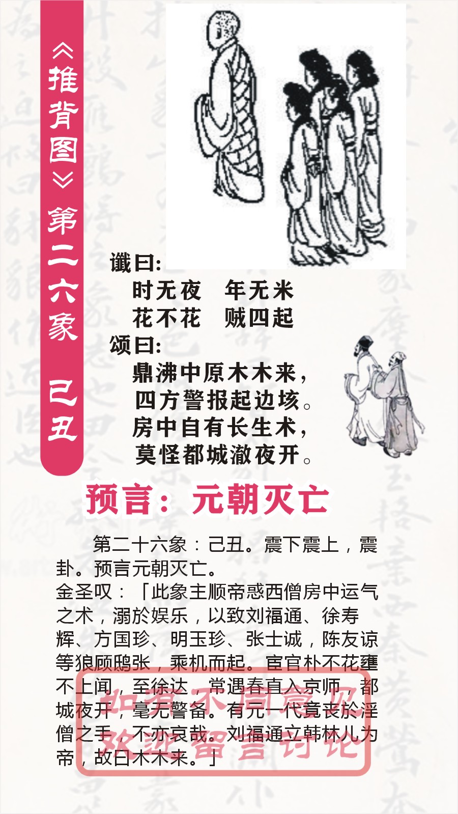 第二六象 已丑震下震上震 谶曰: 时无夜 年无米 花不花 贼四起 颂曰: 鼎沸中原木木来,四方警报起边垓。 房中自有长生术,莫怪都城澈夜开。 以下是对《推背图》第二十六象的解读: 卦象解读 “己丑震下震上震”,震卦象征着震动、雷动,有突发、惊动之意,且多个震卦相叠,意味着震动的程度更加强烈、频繁,预示着这一历史阶段将会出现诸多令人震惊、动荡不安的事件,如同接连不断的雷声,打破平静,给整个局势带来巨大冲击,营造出一种紧张、混乱且多变的氛围。 谶语解读 时无夜,年无米: “时无夜”描绘出一种日夜颠倒、秩序混乱的景象,可能暗示当时社会处于极度的动荡之中,正常的作息时间被打乱,人们生活在不安与混乱里,不分昼夜。“年无米”则直白地体现出粮食匮乏的状况,说明百姓面临着严重的饥荒问题,连基本的温饱都难以保障,反映出当时经济衰败、民生凋敝的严峻现实。 花不花,贼四起: “花不花”表意较隐晦,一种可能的理解是原本美好的事物(花可象征美好)不再美好,寓意着社会失去了往日的繁荣与生机,陷入到一种破败的状态。“贼四起”则明确指出社会治安恶化,盗贼横行,四处抢掠,凸显出当时整个社会的不稳定,人们不仅要忍受生活的困苦,还要时刻面临被抢劫等安全威胁。 颂语解读 鼎沸中原木木来,四方警报起边垓: “鼎沸中原”形象地形容中原地区局势如同开水般沸腾,极为混乱、热闹,各种矛盾冲突交织在一起。“木木”从字谜角度常被认为暗指“林”姓,也许意味着有林姓人物或相关势力在此时登场,对中原地区的局势产生影响。“四方警报起边垓”说明边境地区也不安宁,来自四面八方的警报不断传来,显示出边境面临着诸多外敌侵扰等威胁,整个国家内外交困,陷入到严重的危机之中。 房中自有长生术,莫怪都城澈夜开: “房中自有长生术”表意较为晦涩,一种可能是讽刺当时统治阶层沉迷于追求长生不老之类的虚幻事物,对国家面临的实际问题不闻不问,躲在房中钻研所谓的“长生术”。“莫怪都城澈夜开”则以一种调侃、无奈的语气,暗示由于统治阶层的不作为以及局势的混乱,都城在夜里都是城门大开的状态,毫无安全防范可言,进一步体现出当时的混乱无序以及统治的衰败。 整体意义推测 第二十六象整体上似乎是在描绘一个国家陷入深度危机的历史阶段,先是国内社会秩序混乱、百姓生活困苦(时无夜,年无米,花不花),社会治安也极度恶化(贼四起)。同时,中原地区局势沸腾且有林姓相关因素介入(鼎沸中原木木来),边境又不断传来外敌侵扰的警报(四方警报起边垓),而统治阶层却还沉迷于虚幻之事,导致都城毫无安全保障(房中自有长生术,莫怪都城澈夜开),呈现出一幅内忧外患、混乱衰败的历史画面。不过,《推背图》的解读具有很强的主观性,很难确切地与具体历史事件一一对应,其真实性也缺乏科学依据,仅供参考研究历史文化时使用。 需理性看待 我们要清醒地认识到《推背图》是一部有着神秘色彩和诸多争议的古籍,其文字所蕴含的内容多被后人从不同角度揣摩、解读,所谓的“预言”并不能用科学方法来验证。我们要秉持理性客观的态度,把它当作了解古代文化、古人思维以及探究历史发展脉络的一种参考资料,避免过度迷信和不切实际的联想。 第二十六象:己丑。震下震上,震卦。预言元朝灭亡。 金圣叹:「此象主顺帝惑西僧房中运气之术,溺於娱乐,以致刘福通、徐寿辉、方国珍、明玉珍、张士诚,陈友谅等狼顾鸱张,乘机而起。宦官朴不花壅不上闻,至徐达,常遇春直入京师,都城夜开,毫无警备。有元一代竟丧於淫僧之手,不亦哀哉。刘福通立韩林儿为帝,故曰木木来。」 第1象:(唐朝)甲子 乾下乾上 乾 第2象:(唐朝)乙丑巽下乾上姤(预言武则天称帝) 第3象:(唐朝)丙寅艮下乾上遯(预言武则天造字曌) 第4象:(唐朝)丁卯坤下乾上否(预言张柬之夺回李唐政权) 第5象:(唐朝)戊辰坤下巽上观(预言杨贵妃死于安史之乱) 第6象:(唐朝)已巳坤下艮上剥(预言郭子仪重振大唐) 第7象:(唐朝)庚午震下乾上无妄(吐番部落入寇中原) 第8象:(唐朝)辛未坤下离上晋(李希烈祸乱大唐) 第9象:(唐朝)壬申乾下离上大有(预言黄巢起义) 第10象:(五代)癸酉坎下坎上坎(预言朱温篡唐) 第11象:(五代)申戍兑下坎上节(戏子皇帝后唐庄宗之死) 第12象:(五代)乙亥震下坎上屯(石敬塘割让幽州) 第13象:(五代)丙子离下坎上既济(后周郭威君临天下) 第14象:(五代)丁丑离下兑上革(预言五代终结) 第15象:(北宋)戊寅离下震上丰(宋太祖扫荡群雄) 第16象:(北宋)已卯离下坤上明夷(赵匡胤一统天下) 第17象:(北宋)庚辰坎下坤上师(宋真宗亲征澶渊) 第18象:(北宋)辛巳艮下艮上艮(预言北宋太后刘娥“垂帘听政”) 第19象:(北宋)壬午离下艮上贲(王安石变法) 第20象:(北宋)癸未离下乾上同人(预言蔡京乱政) 第21象:(南宋)甲申兑下艮上损(预言靖康之耻) 第22象:(南宋)乙酉兑下离上睽(康王泥马渡江) 第23象:(南宋)丙戍兑下乾上履(预言蒙古崛起) 第24象:(南宋)丁亥兑下巽上中孚(预言南宋灭亡) 第25象:(元朝)戊子艮下巽上渐(预言元朝国运传10帝) 第26象:(元朝)已丑震下震上震(预言元朝灭亡) 第27象:(明朝)庚寅乾下震上豫(预言明朝开国) 第28象:(明朝)辛卯坎下震上解(预言朱棣篡位) 第29象:(明朝)壬辰巽下震上恒(预言明朝仁宣之治) 第30象:(明朝)癸巳巽下坤上升(预言土木堡之