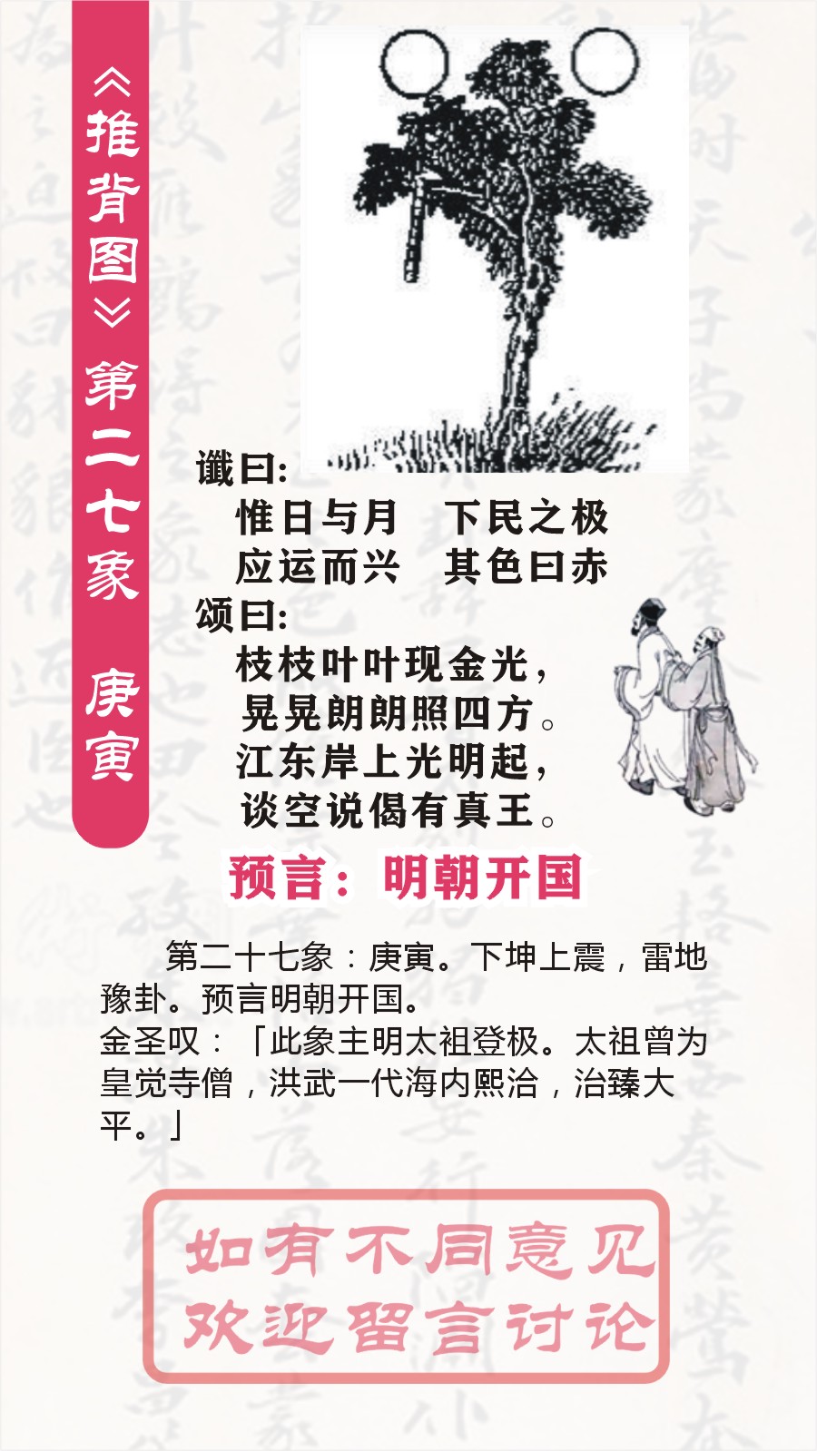 第二七象 庚寅乾下震上豫 谶曰: 惟日与月 下民之极 应运而兴 其色曰赤 颂曰: 枝枝叶叶现金光,晃晃朗朗照四方。 江东岸上光明起,谈空说偈有真王。 以下是对《推背图》第二十七象的解读: 卦象解读 “庚寅乾下震上豫”,豫卦象征着欢乐、和乐之意,有愉悦、舒畅的内涵,同时也包含着顺应时机、积极行动而能收获安乐的意味。乾为天在下,震为雷在上,犹如天雷震动于天上,有振奋人心、带来希望与生机的感觉,为这一象所描述的内容营造出一种顺应时势、充满希望且积极向上的氛围。 谶语解读 惟日与月,下民之极: “惟日与月”从字面理解就是太阳和月亮,日月常象征着光明、永恒等,在这里或许寓意着某种具有权威性、能给世间带来光明和指引的存在。“下民之极”可理解为是普通百姓所能仰望、依靠的最高存在,暗示出现了一个对普通民众来说至关重要且极具影响力的人物或势力,就像日月在天空中对大地万物有着关键影响一样,在百姓的生活中占据着核心地位。 应运而兴,其色曰赤: “应运而兴”表明这个关键人物或势力是顺应着时代的运势、潮流而兴起发展的,有着顺应天意、契合时势的正当性。“其色曰赤”中“赤”色在古代常与火相关联,也象征着革命、正义等,意味着这个兴起的势力有着鲜明的特征,可能代表着新生的、充满热情与变革力量的一方,或许与某种革新、起义等改变旧有格局的行动有关。 颂语解读 枝枝叶叶现金光,晃晃朗朗照四方: 这句话运用了形象的比喻手法,将所描述的对象比作一棵大树,其枝枝叶叶都散发着金色的光芒,光芒明亮耀眼,能够照亮四方,寓意着这个兴起的势力有着广泛且强大的影响力,其光辉所及之处都能带来希望、改变和积极的影响,就像光芒驱散黑暗一样,对周围的环境和人们起到引领作用。 江东岸上光明起,谈空说偈有真王: “江东岸上光明起”点明了地点,在江东地区出现了光明,意味着这个带来希望与变革的势力是从江东一带兴起的,江东在历史上往往是有着重要战略地位和文化底蕴的区域,此处兴起也预示着后续会产生较大的影响。“谈空说偈有真王”较难确切解释,一种可能是说这个势力的领导者有着独特的思想、理念(谈空说偈或许象征着有一定的思想境界或宗教文化背景),但同时又是实实在在的王者,能够带领众人走向新的发展道路,有着王者的风范和统治能力。 整体意义推测 第二十七象整体上大概是在描绘一个顺应时代潮流而兴起的重要历史阶段,先是出现了一个如同日月般受百姓仰望、极具影响力的关键势力(惟日与月,下民之极),它顺应运势而生且有着鲜明的革新色彩(应运而兴,其色曰赤)。这个势力影响力广泛,光芒能照亮四方(枝枝叶叶现金光,晃晃朗朗照四方),并且是从江东地区崛起,其领导者有着独特思想和统治能力(江东岸上光明起,谈空说偈有真王),呈现出一幅充满希望、变革力量涌动的历史画面。不过,《推背图》的解读具有较强主观性,很难精准对应具体历史事件,仅供参考研究历史文化时使用。 需理性看待 我们应认识到《推背图》是一部有着神秘色彩的古籍,其内容多是后人不断揣摩、解读的对象,所谓的“预言”并不能被科学所验证。我们要以理性客观的态度去看待它,把它当作了解古代文化、古人思维以及历史演变脉络的一种参考资料,避免过度迷信和不切实际的联想。 第二十七象:庚寅。下坤上震,雷地豫卦。预言明朝开国。 金圣叹:「此象主明太袓登极。太祖曾为皇觉寺僧,洪武一代海内熙洽,治臻大平。」 第1象:(唐朝)甲子 乾下乾上 乾 第2象:(唐朝)乙丑巽下乾上姤(预言武则天称帝) 第3象:(唐朝)丙寅艮下乾上遯(预言武则天造字曌) 第4象:(唐朝)丁卯坤下乾上否(预言张柬之夺回李唐政权) 第5象:(唐朝)戊辰坤下巽上观(预言杨贵妃死于安史之乱) 第6象:(唐朝)已巳坤下艮上剥(预言郭子仪重振大唐) 第7象:(唐朝)庚午震下乾上无妄(吐番部落入寇中原) 第8象:(唐朝)辛未坤下离上晋(李希烈祸乱大唐) 第9象:(唐朝)壬申乾下离上大有(预言黄巢起义) 第10象:(五代)癸酉坎下坎上坎(预言朱温篡唐) 第11象:(五代)申戍兑下坎上节(戏子皇帝后唐庄宗之死) 第12象:(五代)乙亥震下坎上屯(石敬塘割让幽州) 第13象:(五代)丙子离下坎上既济(后周郭威君临天下) 第14象:(五代)丁丑离下兑上革(预言五代终结) 第15象:(北宋)戊寅离下震上丰(宋太祖扫荡群雄) 第16象:(北宋)已卯离下坤上明夷(赵匡胤一统天下) 第17象:(北宋)庚辰坎下坤上师(宋真宗亲征澶渊) 第18象:(北宋)辛巳艮下艮上艮(预言北宋太后刘娥“垂帘听政”) 第19象:(北宋)壬午离下艮上贲(王安石变法) 第20象:(北宋)癸未离下乾上同人(预言蔡京乱政) 第21象:(南宋)甲申兑下艮上损(预言靖康之耻) 第22象:(南宋)乙酉兑下离上睽(康王泥马渡江) 第23象:(南宋)丙戍兑下乾上履(预言蒙古崛起) 第24象:(南宋)丁亥兑下巽上中孚(预言南宋灭亡) 第25象:(元朝)戊子艮下巽上渐(预言元朝国运传10帝) 第26象:(元朝)已丑震下震上震(预言元朝灭亡) 第27象:(明朝)庚寅乾下震上豫(预言明朝开国) 第28象:(明朝)辛卯坎下震上解(预言朱棣篡位) 第29象:(明朝)壬辰巽下震上恒(预言明朝仁宣之治) 第30象:(明朝)癸巳巽下坤上升(预言土木堡之变) 第31象:(明朝)甲午离下巽上家人(预言魏忠贤之乱) 第32象:(明朝)乙未巽下坎上井(预言闯王李自成灭明) 第33象:(清朝)丙申
