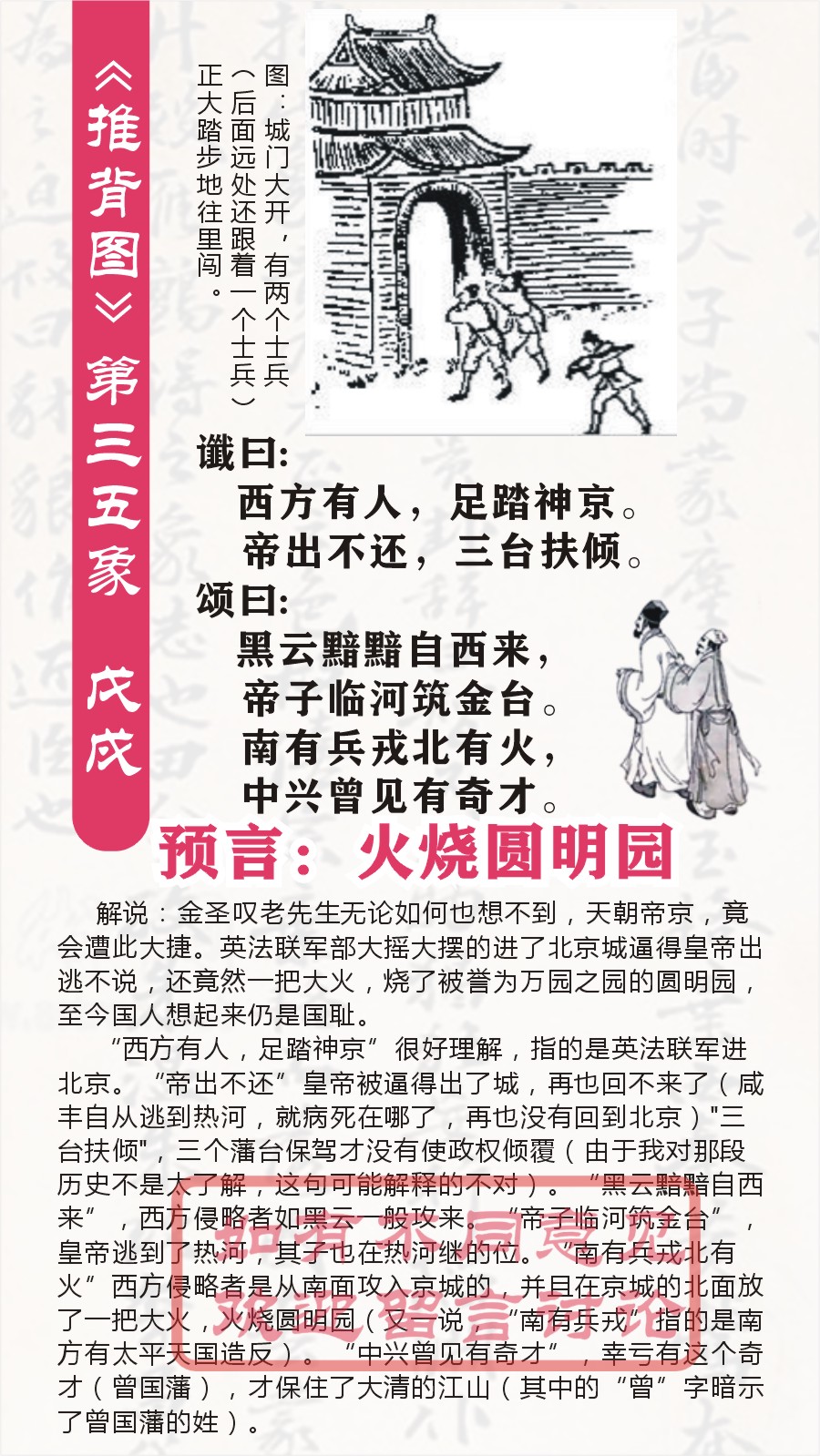第三五象 戊戍震下兑上随(火烧圆明园的预言) 图:城门大开,有两个士兵(后面远处还跟着一个士兵)正大踏步地往里闯。 谶曰: 西方有人,足踏神京。 帝出不还,三台扶倾。 颂曰: 黑云黯黯自西来,帝子临河筑金台。 南有兵戎北有火,中兴曾见有奇才。 第三十五象:戊戌。震下兑上,泽雷随卦。预言火烧圆明园,同治时期曾国藩、左宗棠、李鸿章中兴。 以下是对《推背图》第三十五象的解读: 卦象解读 “戊戌震下兑上随”,随卦象征着随从、跟随之意,有顺应、随和的内涵,也意味着事物之间相互依随、顺势而动。震为雷在下,兑为泽在上,雷入泽中,雷声伴随着泽水的波动,呈现出一种相互呼应、顺势变化的状态。放在这一象所描述的历史背景中来看,可能暗示着当时的局势是各方势力相互影响,一些情况的发展有着顺势而为的特点,同时也预示着将有重大的、顺应形势变化而发生的事件出现。 谶语解读 西方有人,足踏神京: “西方有人”明确指出是来自西方的势力,在近代历史背景下,很容易让人联想到西方列强。“足踏神京”则是形象地描述了这些西方势力侵入到京城(当时的北京)的情况,意味着他们凭借武力等手段进入了中国的都城,对中国的核心地带实施了侵犯,这与火烧圆明园时英法联军等西方列强攻入北京的史实相契合,预示着西方列强对京城造成了重大冲击。 帝出不还,三台扶倾: “帝出不还”描绘出皇帝因为京城被侵占等原因离开了京城,并且没能再回来,反映出当时清朝皇帝为躲避战乱等情况出逃的史实,比如咸丰帝在英法联军逼近北京时逃往承德避暑山庄,之后未能再返回北京就驾崩了。“三台扶倾”较难确切解释,一种可能是“三台”指代朝廷中重要的辅政大臣或者几股能够支撑局势、稳定朝纲的力量,在皇帝出逃后,依靠这些力量来尽力维持摇摇欲坠的国家局面,希望能够挽救国家于危难之中。 颂语解读 黑云黯黯自西来,帝子临河筑金台: “黑云黯黯自西来”用形象的手法营造出一种压抑、不祥的氛围,象征着西方列强如乌云般带着威胁从西方涌来,预示着他们带来的是破坏和灾难。“帝子临河筑金台”中“帝子”可指代皇帝,“临河”可能是说皇帝所在的位置临近河流(比如承德避暑山庄靠近一些河流),“筑金台”有期望招揽贤才、重振朝纲的寓意,也许暗示皇帝在出逃后的地方试图通过一些举措来巩固统治、集结力量以应对危机,但实际效果可能并不理想。 南有兵戎北有火,中兴曾见有奇才: “南有兵戎”可能是指南方当时也存在着一些军事斗争或者不稳定因素,比如太平天国运动等在南方持续造成动荡。“北有火”则直白地对应了火烧圆明园这一重大历史事件,圆明园地处北京城北,被英法联军纵火焚毁,造成了巨大的损失。“中兴曾见有奇才”意思是在这样艰难的局势下,似乎曾经出现过有才能的人,人们期望这些奇才能够力挽狂澜,助力国家实现中兴,不过从历史发展来看,当时想要实现真正的中兴面临着诸多困难,最终未能达成理想的状态。 整体意义推测 第三十五象整体上大概是在描绘一个遭受西方列强侵略、国家陷入危机的历史阶段,先是西方势力侵入京城(西方有人,足踏神京),导致皇帝出逃,朝廷依靠一些力量维持局面(帝出不还,三台扶倾)。接着西方列强带来如黑云般的威胁,皇帝在别处试图巩固统治(黑云黯黯自西来,帝子临河筑金台),而南方有战乱,北方有圆明园被焚毁的灾难(南有兵戎北有火),期间虽期望有奇才来实现中兴但未能如愿(中兴曾见有奇才),呈现出一幅内忧外患、国家遭受重创的历史画面。不过,《推背图》的解读具有较强主观性,很难精准对应具体历史事件,仅供参考研究历史文化时使用。 需理性看待 我们应认识到《推背图》是一部有着神秘色彩的古籍,其内容多是后人不断揣摩、解读的对象,所谓的“预言”并不能被科学所验证。我们要以理性客观的态度去看待它,把它当作了解古代文化、古人思维以及历史演变脉络的一种参考资料,避免过度迷信和不切实际的联想。 金圣叹:「此象疑有出狩事,亦乱兆也。」 解说:金圣叹老先生无论如何也想不到,天朝帝京,竟会遭此大捷。英法联军部大摇大摆的进了北京城逼得皇帝出逃不说,还竟然一把大火,烧了被誉为万园之园的圆明园,至今国人想起来仍是国耻。 “西方有人,足踏神京”很好理解,指的是英法联军进北京。“帝出不还”皇帝被逼得出了城,再也回不来了(咸丰自从逃到热河,就病死在哪了,再也没有回到北京)"三台扶倾",三个藩台保驾才没有使政权倾覆(由于我对那段历史不是太了解,这句可能解释的不对)。“黑云黯黯自西来”,西方侵略者如黑云一般攻来。“帝子临河筑金台”,皇帝逃到了热河,其子也在热河继的位。“南有兵戎北有火”西方侵略者是从南面攻入京城的,并且在京城的北面放了一把大火,火烧圆明园(又一说,“南有兵戎”指的是南方有太平天国造反)。“中兴曾见有奇才”,幸亏有这个奇才(曾国藩),才保住了大清的江山(其中的“曾”字暗示了曾国藩的姓)。 第1象:(唐朝)甲子 乾下乾上 乾 第2象:(唐朝)乙丑巽下乾上姤(预言武则天称帝) 第3象:(唐朝)丙寅艮下乾上遯(预言武则天造字曌) 第4象:(唐朝)丁卯坤下乾上否(预言张柬之夺回李唐政权) 第5象:(唐朝)戊辰坤下巽上观(预言杨贵妃死于安史之乱) 第6象:(唐朝)已巳坤下艮上剥(预言郭子仪重振