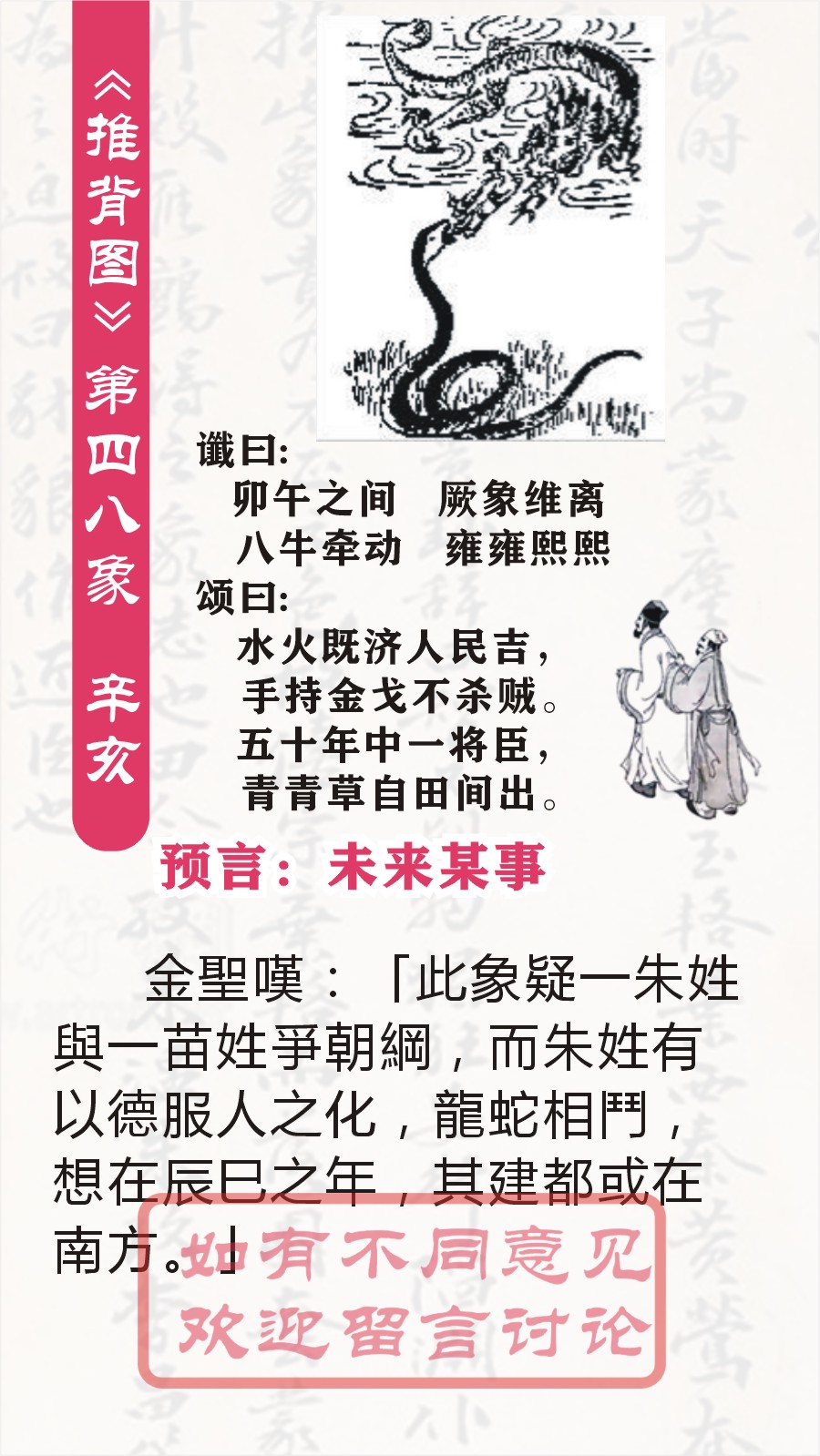 第四八象 辛亥離下乾上同人 讖曰: 卯午之間,厥象維離。 八牛牽動,雍雍熙熙。 頌曰: 水火既濟人民吉,手持金戈不殺賊。 五十年中一將臣,青青草自田間出。 第四十八象:辛亥。离下乾上,天火同人卦。预言未来某事。 以下是对《推背图》第四十八象的解读,要知道《推背图》本身充满神秘色彩,解读多具主观性,所谓“预言”并无科学依据来验证,仅作文化研究、探寻古人思维角度的参考: 卦象解读 “辛亥离下乾上同人”,同人卦象征着与人同心、和同于人,有团结、聚合众人之意,寓意着人们能够求同存异、齐心协力去做事情。离为火在下,乾为天在上,火在天下燃烧,有光明照耀四方的感觉,象征着一种积极、光明且众人齐心的良好氛围,也为这一象所描述的内容营造出一种和谐、蓬勃发展的态势。 谶语解读 卯午之间,厥象维离: “卯午之间”从时间角度来看,卯和午涉及到十二地支,或许是暗指某个特定的时间段,不过具体所指较难确切定论,可能象征着一个关键的时间区间。“厥象维离”指出其卦象呈现离的状态,离卦有光明、美丽、依附等象征意义,也许意味着在这个特定时间里,会出现一些带有光明、向好趋势的情况,比如局势变得明朗、美好的景象展现等情况出现。 八牛牵动,雍雍熙熙: “八牛”从字谜角度可理解为“朱”字,可能暗指朱姓相关的人物、势力或者某种以朱为象征的关键事物。“牵动”表示其有着重要影响力,能够带动、影响其他事物发展。“雍雍熙熙”形容社会呈现出和乐、祥和、繁荣的状态,意味着由于这个“八牛”相关因素的作用,整个社会变得和谐安乐,人们安居乐业,一片繁荣昌盛的景象,暗示其在推动社会良好发展方面起到了关键作用。 颂语解读 水火既济人民吉,手持金戈不杀贼: “水火既济”是《易经》里的一个卦象,象征着事情发展到一种成功、和谐的状态,水与火本是相克的,但在既济卦中达到了平衡、协调,寓意着社会各方面的关系、事务等都处理得很妥当,所以“人民吉”,也就是百姓能够过上吉祥、幸福的生活。“手持金戈不杀贼”则有一种别样的寓意,说明虽然有着武力装备(金戈),但不是用于征伐、杀戮,可能象征着国家处于和平稳定状态,武力更多是作为一种保障和平、维护秩序的手段,而非用于主动挑起战争,体现出一种和平发展的理念。 五十年中一将臣,青青草自田間出: “五十年中”可能是指代一个大概的时间周期,在这个时间段内出现了一位重要的将领或者大臣(一将臣),其有着关键影响力。“青青草自田間出”描绘出一种形象,象征着这位人物出身平凡,就像田间生长的青草一样,来自普通的民间,有着接地气、贴近民众的特点,暗示其能理解民众需求,在相应的职位上为国家和百姓做出贡献。 我们应该以理性客观的态度看待《推背图》的这些内容,把它作为了解古代文化、古人思想观念以及洞察古人对未来设想的一种参考资料,避免过度迷信或牵强附会地去对应具体历史事件或现实情况。 金聖嘆:「此象疑一朱姓與一苗姓爭朝綱,而朱姓有以德服人之化,龍蛇相鬥,想在辰巳之年,其建都或在南方。」 第1象:(唐朝)甲子 乾下乾上 乾 第2象:(唐朝)乙丑巽下乾上姤(预言武则天称帝) 第3象:(唐朝)丙寅艮下乾上遯(预言武则天造字曌) 第4象:(唐朝)丁卯坤下乾上否(预言张柬之夺回李唐政权) 第5象:(唐朝)戊辰坤下巽上观(预言杨贵妃死于安史之乱) 第6象:(唐朝)已巳坤下艮上剥(预言郭子仪重振大唐) 第7象:(唐朝)庚午震下乾上无妄(吐番部落入寇中原) 第8象:(唐朝)辛未坤下离上晋(李希烈祸乱大唐) 第9象:(唐朝)壬申乾下离上大有(预言黄巢起义) 第10象:(五代)癸酉坎下坎上坎(预言朱温篡唐) 第11象:(五代)申戍兑下坎上节(戏子皇帝后唐庄宗之死) 第12象:(五代)乙亥震下坎上屯(石敬塘割让幽州) 第13象:(五代)丙子离下坎上既济(后周郭威君临天下) 第14象:(五代)丁丑离下兑上革(预言五代终结) 第15象:(北宋)戊寅离下震上丰(宋太祖扫荡群雄) 第16象:(北宋)已卯离下坤上明夷(赵匡胤一统天下) 第17象:(北宋)庚辰坎下坤上师(宋真宗亲征澶渊) 第18象:(北宋)辛巳艮下艮上艮(预言北宋太后刘娥“垂帘听政”) 第19象:(北宋)壬午离下艮上贲(王安石变法) 第20象:(北宋)癸未离下乾上同人(预言蔡京乱政) 第21象:(南宋)甲申兑下艮上损(预言靖康之耻) 第22象:(南宋)乙酉兑下离上睽(康王泥马渡江) 第23象:(南宋)丙戍兑下乾上履(预言蒙古崛起) 第24象:(南宋)丁亥兑下巽上中孚(预言南宋灭亡) 第25象:(元朝)戊子艮下巽上渐(预言元朝国运传10帝) 第26象:(元朝)已丑震下震上震(预言元朝灭亡) 第27象:(明朝)庚寅乾下震上豫(预言明朝开国) 第28象:(明朝)辛卯坎下震上解(预言朱棣篡位) 第29象:(明朝)壬辰巽下震上恒(预言明朝仁宣之治) 第30象:(明朝)癸巳巽下坤上升(预言土木堡之变) 第31象:(明朝)甲午离下巽上家人(预言魏忠贤之乱) 第32象:(明朝)乙未巽下坎上井(预言闯王李自成灭明) 第33象:(清朝)丙申巽下兑上大过(预言清兵入关,传十帝) 第34象:(清朝)丁酉巽下巽上巽(太平天国的预言) 第35象:(清朝)戊戍震下兑上随(火烧圆明园的预言) 第36象:(清朝)己亥乾下巽上小畜(慈喜逃到西安的预言) 第37象:(民国)庚子震下巽上益(建立中华民国的预言) 第38象:(民国)辛丑震下离上噬嗑(第一次世界大战的预言) 第39象:(民国)壬寅巽下兑上颐(日本侵华的预言) 第40象:(