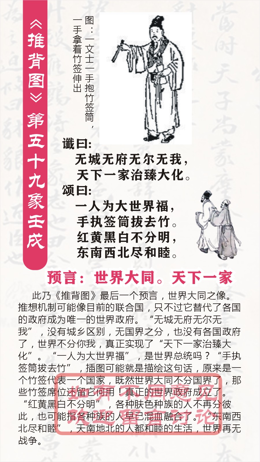第五十九象:壬戌。艮下兑上,泽山咸卦。预言世界大同。天下一家,治臻大化。《推背图》最后一个预言:世界大同之像