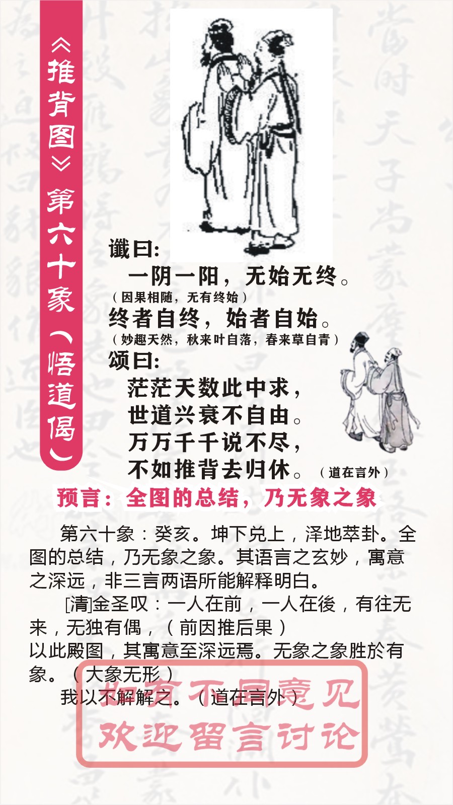 《推背图》最后一象第六十象(悟道偈) 谶曰 一阴一阳,无始无终。(因果相随,无有终始) 终者自终,始者自始。 (妙趣天然,秋来叶自落,春来草自青) 颂曰 茫茫天数此中求, 世道兴衰不自由。 万万千千说不尽, 不如推背去归休。(道在言外) 第六十象:癸亥。坤下兑上,泽地萃卦。全图的总结,乃无象之象。其语言之玄妙,寓意之深远,非三言两语所能解释明白。 以下是对《推背图》第六十象也就是最后一象(悟道偈)的解读: 谶语解读 一阴一阳,无始无终。(因果相随,无有终始): “一阴一阳”体现了中国传统哲学里阴阳相互对立又相互依存、相互转化的观念,世间万物皆可归纳为阴阳两面,二者共同构成了宇宙的基本秩序与变化规律。“无始无终”强调这种阴阳变化的规律是永恒的,不存在绝对的起始点和终结点,如同因果循环一样,是连绵不断、周而复始的,意味着世间万物的发展演变都遵循着这样一种内在且永恒的逻辑,不会因人为设定的时间界限等而终止,反映出一种对宇宙、世间运转规律的深邃洞察。 终者自终,始者自始。(妙趣天然,秋来叶自落,春来草自青): 这句话进一步阐释了事物发展的自然性,就如同秋天树叶自然飘落,春天小草自然生长一样,事物都有其自身该终结的时候就会终结,该开始的时候就会开始,有着内在的自然节奏和必然性,不受外界过多的强行干预,强调了一种顺应自然、尊重事物发展客观规律的态度,展现出一种对世间万物自在变化的体悟。 颂语解读 茫茫天数此中求: “天数”常被视为上天安排的、蕴含着命运和事物发展走向的定数,这里指出世间万事万物的发展脉络、兴衰变化等都蕴含在这茫茫的天数之中,意味着人们若想要探寻世界变化、历史演进的奥秘,需要从这看似神秘的天数里去寻找线索,不过也侧面反映出天数的高深莫测、难以完全洞悉,有一种对命运、对宏观世界变化规律的敬畏之感。 世道兴衰不自由: 表明世间的兴衰成败并非是可以随心所欲去掌控的,它受到诸多因素的影响,既有前文提到的阴阳变化、自然规律等内在因素,也可能包含外在的各种复杂条件等,强调了世道的发展有着自身的客观性,人们在大的历史潮流、社会兴衰面前往往是较为被动的,体现出一种对世事无常、难以完全左右局面的无奈认知。 万万千千说不尽: 寓意着世间的现象、历史的演变、人事的种种情况是极为繁杂丰富的,哪怕用尽千言万语也难以完全表述清楚,体现出世界的复杂性以及人们想要彻底阐释清楚一切的无力感,说明世间诸多道理、变化等有着无尽的内容等待人们去体会、去感悟,不是简单靠语言就能穷尽的。 不如推背去归休。(道在言外): 这一句有着一种超脱、释然的意味,意思是既然世间之事如此复杂难尽言说,又难以完全把控,那还不如像当初李淳风、袁天罡推背停止预言那样(相传二人推背而止,不再继续往后推算),放下对未来种种的执着探寻,回归到一种闲适、平和的状态中去。同时也暗示着真正的“道”、那些高深的道理和规律往往是超越言语所能表达的范畴的,需要人们用心去体悟、在生活实践中去感受,而不是一味地去强求知晓和把控未来的一切。 总体而言,《推背图》的这最后一象充满了哲学思辨与对人生、对世界的深刻感悟,它从一种宏观且带有神秘色彩的角度提醒人们要尊重自然规律、认识到世事的复杂难测,进而以一种豁达、顺应的心态去面对生活与历史的发展,我们更多可将其作为窥探古人思想境界和哲学思维的一种参考,而非去纠结其所谓的“预言”等具体指向。 [清]金圣叹: 一人在前,一人在後,有往无来,无独有偶,(前因推后果) 以此殿图,其寓意至深远焉。无象之象胜於有象。(大象无形) 我以不解解之。(道在言外) 第1象:(唐朝)甲子 乾下乾上 乾 第2象:(唐朝)乙丑巽下乾上姤(预言武则天称帝) 第3象:(唐朝)丙寅艮下乾上遯(预言武则天造字曌) 第4象:(唐朝)丁卯坤下乾上否(预言张柬之夺回李唐政权) 第5象:(唐朝)戊辰坤下巽上观(预言杨贵妃死于安史之乱) 第6象:(唐朝)已巳坤下艮上剥(预言郭子仪重振大唐) 第7象:(唐朝)庚午震下乾上无妄(吐番部落入寇中原) 第8象:(唐朝)辛未坤下离上晋(李希烈祸乱大唐) 第9象:(唐朝)壬申乾下离上大有(预言黄巢起义) 第10象:(五代)癸酉坎下坎上坎(预言朱温篡唐) 第11象:(五代)申戍兑下坎上节(戏子皇帝后唐庄宗之死) 第12象:(五代)乙亥震下坎上屯(石敬塘割让幽州) 第13象:(五代)丙子离下坎上既济(后周郭威君临天下) 第14象:(五代)丁丑离下兑上革(预言五代终结) 第15象:(北宋)戊寅离下震上丰(宋太祖扫荡群雄) 第16象:(北宋)已卯离下坤上明夷(赵匡胤一统天下) 第17象:(北宋)庚辰坎下坤上师(宋真宗亲征澶渊) 第18象:(北宋)辛巳艮下艮上艮(预言北宋太后刘娥“垂帘听政”) 第19象:(北宋)壬午离下艮上贲(王安石变法) 第20象:(北宋)癸未离下乾上同人(预言蔡京乱政) 第21象:(南宋)甲申兑下艮上损(预言靖康之耻) 第22象:(南宋)乙酉兑下离上睽(康王泥马渡江) 第23象:(南宋)丙戍兑下乾上履(预言蒙古崛起) 第24象:(南宋)丁亥兑下巽上中孚(预言南宋灭亡) 第25象:(元朝)戊子艮下巽上渐(预言元朝国运传10帝) 第26象:(元朝)已丑震下震上震(预言元朝灭亡) 第27象:(明朝)庚寅乾下震上豫(预言明朝开国) 第28象:(明朝)辛卯坎下震上解(预言朱棣篡位) 第29象:(明朝)壬辰巽下震上恒(预言明朝仁宣之治) 