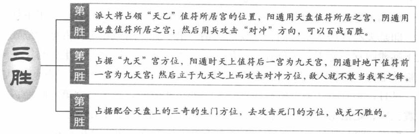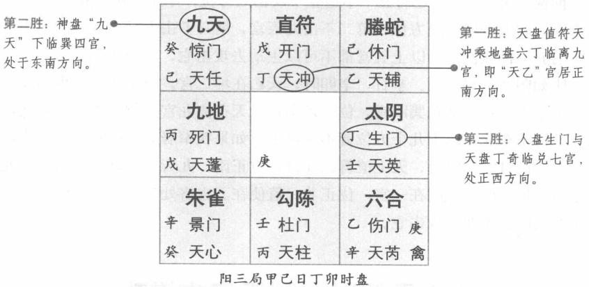 【原文】 天乙之神所在宫,大将宜居击对冲。 假令值符居离九,天英坐取击天蓬。 【原注】 汤谓曰:“第一胜天乙宫,天上值符乘天乙宫,上将居之,用兵击其冲,百胜也。” 按《万一诀》云:“若在阳遁,即用天上值符所居宫;若在阴遁,即用地下值符所居宫。上将居之,而击其冲,胜。” 第二胜九天宫。阳遁天上值符后一为九天,阴遁地下值符前一为九天。我军立九天之上,而击其冲,则敌人不敢当我之锋。 第三胜生门宫,谓生门合三奇之吉宫。上将引兵从生门击死门,百战百胜。 又曰:“背亭亭向天门一胜,背月建二胜,背生击死三胜。大同小异也。” 假令大寒上元阳三局,甲已日丁卯时,天上值符乘六丁,临九宫,正南为天乙宫,为第一胜也。九天四宫东南第二胜也。生门与丁奇合七宫正西第三胜也。 假令阴八局,甲已之日平旦时,地下值符在八宫东北,天乙宫为第一胜也。 九天在三宫正东,第二胜。生门临六宫西北第三胜也。有五不可击。 汤谓曰:“一不击天乙宫,二不击九天宫,三不击生门宫,四不击九地宫,五不击值使宫。”以上皆不可击。 假令阳八局,丙辛日辛卯时,天乙在坤二宫西南,生门在三宫正东,九地在 四宫东南,值使在八宫东北,以上并不可击,我军居之,必雄胜。 假令阴七局,甲已之日丙寅时,天上值符临九宫正南,九天在二宫西南,生门在一宫正北,九地在七宫正西,值使在五宫寄二官西南,以上不可击,我军居之,必雄胜。 注云:上将居之,引兵而击其冲,百战百胜。按《万一诀》云:“若在阳遁,即用天上值符所居之宫;若在阴遁,即用地下值符所至之宫,而击其冲,则百战百胜也。” 详解三胜和五不击 在奇门遁甲应用于战争中时,有三胜和五不击之说,下面就加以详细解析,并举例说明其方位。 【白话提要】 这段歌诀也是讲的作战的占据点与出击方向的选择。据说,首先考虑的“第一胜”,即第一种打胜仗的方法,是派大将占领“天乙”值符所居宫的位置。在冬至后的阳遁,用天盘值符所居之宫,在夏至后的阴遁则取地盘值符所居之宫。然后用兵攻击“对冲”方向,可以百战百胜。第二胜,是占据“九天”宫方位。阳遁时,天上值符后一宫为九天宫;阴遁时,地下值符前一宫为九天宫,如果立于九天之上而攻击对冲方位,那么,敌人就不敢当我军之锋。第三胜,是占据配合天上的三奇的生门方位,去攻击死门的方位,也是战无不胜的。至于说背靠亭亭而向天门为一胜,背靠月建为二胜,背靠生门攻击死门三胜,这说法不过是大同小异。 比如大寒时上元阳遁三局,甲、己日,丁卯时,天上值符乘上六丁下临离九宫,即是天乙宫居正南方向,这就是所谓“第一胜”所应该事先占据的位置。九天下临巽四宫,处于东南位置,这是“第二胜”所应占据之处,生门与丁奇配合下临兑七宫,处正西方向,这是“第三胜”所应占据的位置方向。又如阴遁八局,甲、己日,平旦时,地下值符在艮八宫,处东北方向,为天乙宫第一胜地;九天在震三宫,处正东方向,为第二胜地;生门临乾六宫,处西北方向,为第三胜地。据说,除三胜外,还有五个不适宜于攻击的方位,称为“五不击”。第一不击天乙宫,即值符所在之方位,第二不击九天宫,第三不击生门宫,第四不击九地宫,第五不击值使宫,以上五宫都不可以主动去攻击它,否则不利。 比如阳遁八局,丙、辛日,辛卯时,天乙在坤二宫,位于西南;生门在震三宫,位于正东;九地在巽四宫,位于东南;九天在离九宫,位于正南;值使在艮八宫,位于东北;以上几个方位皆不可攻击,如果我军居之则必胜。又如阴遁七局,甲、己日,丙寅时,天上值符临九宫,位正南;九天在三宫,位西南;九地在七宫,位正西;生门在一宫,位正北;值使在五宫寄处二宫,位西南;以上这五个方位同样不要去攻击它。 |